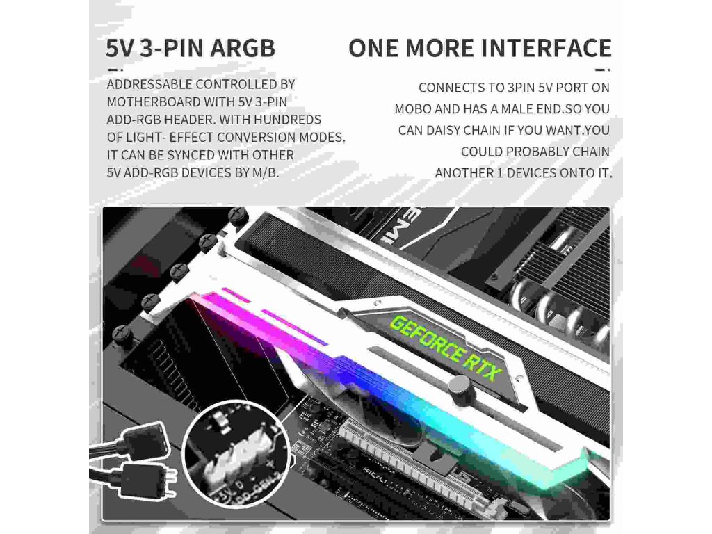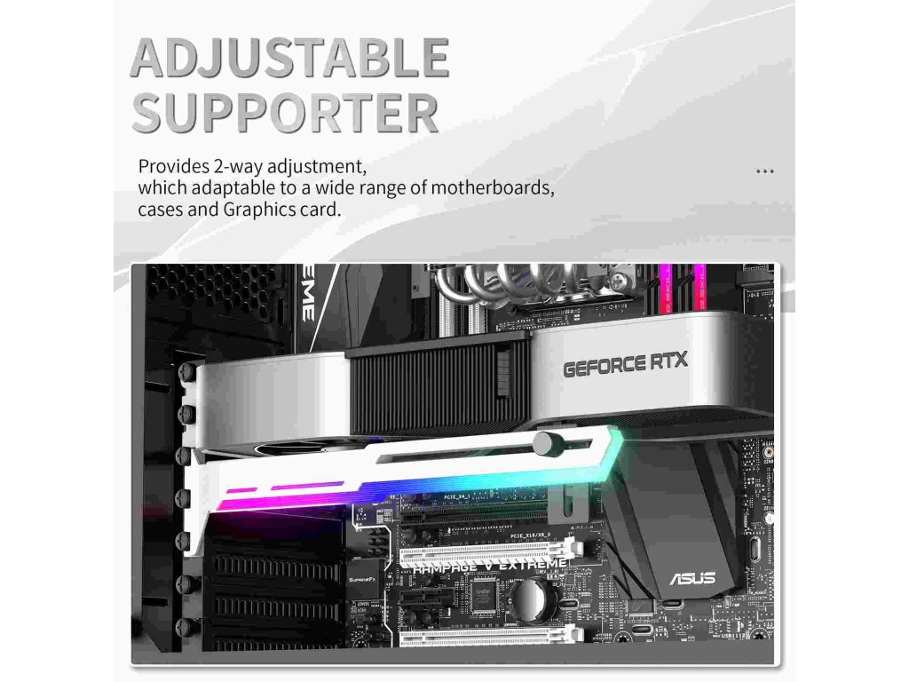Štýlová verzia tejto opory vašej grafickej karty je vyrobená z oceľového práškovo lakovaného plechu a plastu, zabraňuje prehýbaniu väčších kariet v slotu a dodáva tak zostave lepšiu celkovú stabilitu. Súčasťou je silikónová posuvná opora, ktorú je možné posunúť horizontálne aj vertikálne a umožňuje inštaláciu v rôznych miestach karty, pre maximálnu kompatibilitu s väčšinou kariet. Rozmery držiaka sú 280 x 52mm.