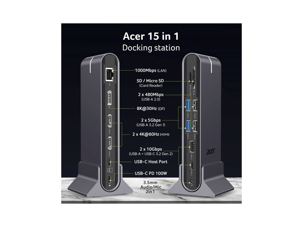 Acer 15in1 Type-C Universal Docking Station : USB-C, 2x USB-A 2.0, 1x USB-A 3.2 Gen2, 1x USB-A 3.2 Gen1, 1x USB-C Gen1,
