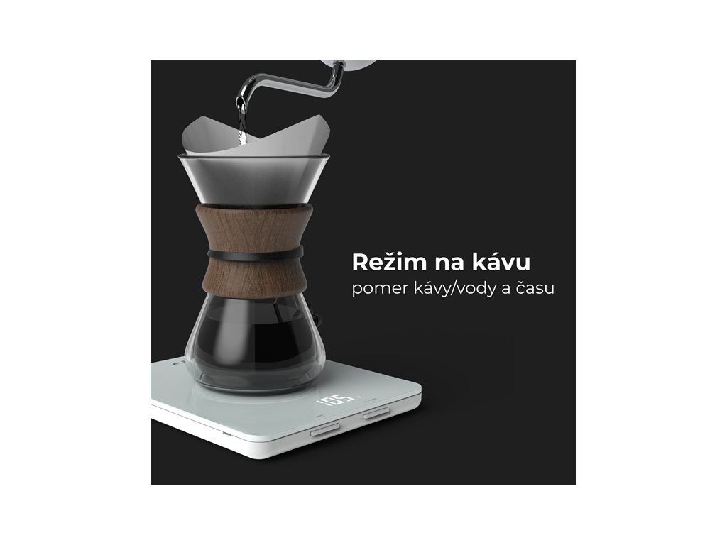 Presne meranie kavy a vody na dokonale varenie. Navrhovane pomery na zaklade sposobu varenia a preferencii. Funkcia casovaca sleduje cas varenia pre optimalnu chut a aromu pri akejkolvek metode, ako je french press alebo pour-over