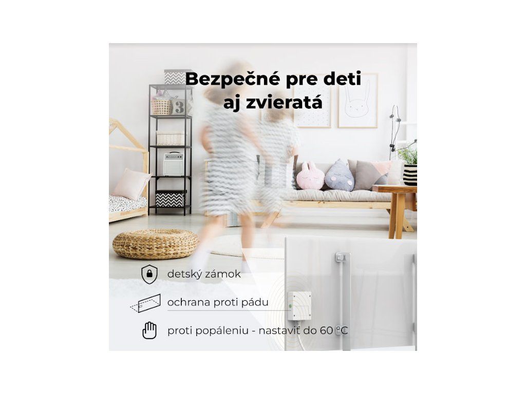 Vyhrievací panel sa pri páde automaticky vypne. K dispozícii je zvuková notifikácia od ohrievača, ako aj správa v aplikácii. Ochrana pred náhodným zapnutím dieťaťom cez Detský zámok v aplikácii. Pre pohodlné a bezpečné používanie nastavte teplotu panelu na 60 stupňov - Hypoalergénne vykurovanie pre vašu spokojnost