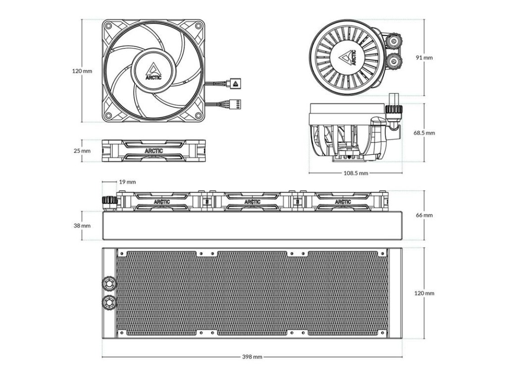 Liquid Freezer III Pro 360 A-RGB (White) Multi Compatible All-in-One CPU Water Cooler with A-RGB General Specifications TIM MX-6 (0.8 g) Warranty 6 Years Operating Ambient Temperature 0—40 °C Pump 800–2800 rpm (PWM controlled) Current | Voltage 0.35 A | 12 V DC Cold Plate Copper, Micro Skived Fins Tube Length 450 mm Tube Diameter Outer: 12.4 mm Inner: 6.0 mm Weight 2005 g Compatibillity Intel LGA1851, LGA1700 AMD AM5, AM4 Radiator Material Aluminium Dimensions 398 (L) x 120 (W) x 38 (H) mm VRM Module VRM Fan 400–2500 rpm (PWM-controlled) Current | Voltage 0.05 A | 12 V DC LEDs 12x A-RGB Gen2 LEDs Current | Voltage 0.40 A | 5 V DC Radiator Fan General 3x P12 Pro A-RGB Speed 600–3000 rpm Airflow 77 cfm | 131 mł/h3/h Static Pressure 6.9 mmH2O Bearing Fluid Dynamic Bearing Current | Voltage 0.33 A | 12 V DC Connector 4-Pin Fan Plug RGB LEDs 12x A-RGB Gen2 LEDs Current | Voltage 0.40 A | 5 V DC Connector 3-Pin A-RGB Plug + 3-Pin SocketDodatočné parametre