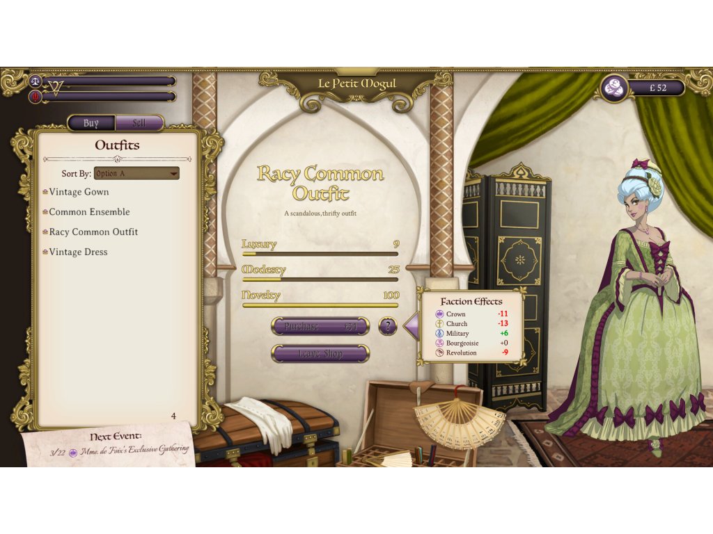 18th century Paris - a city of love, lies and revolution. You are a woman of fashion trying to survive the political turmoil. Date a cast of unforgettable characters. Amass the wealth and respect you deserve. Engage in gossip that can alter the course of history, or lead you to the guillotine.About The Game