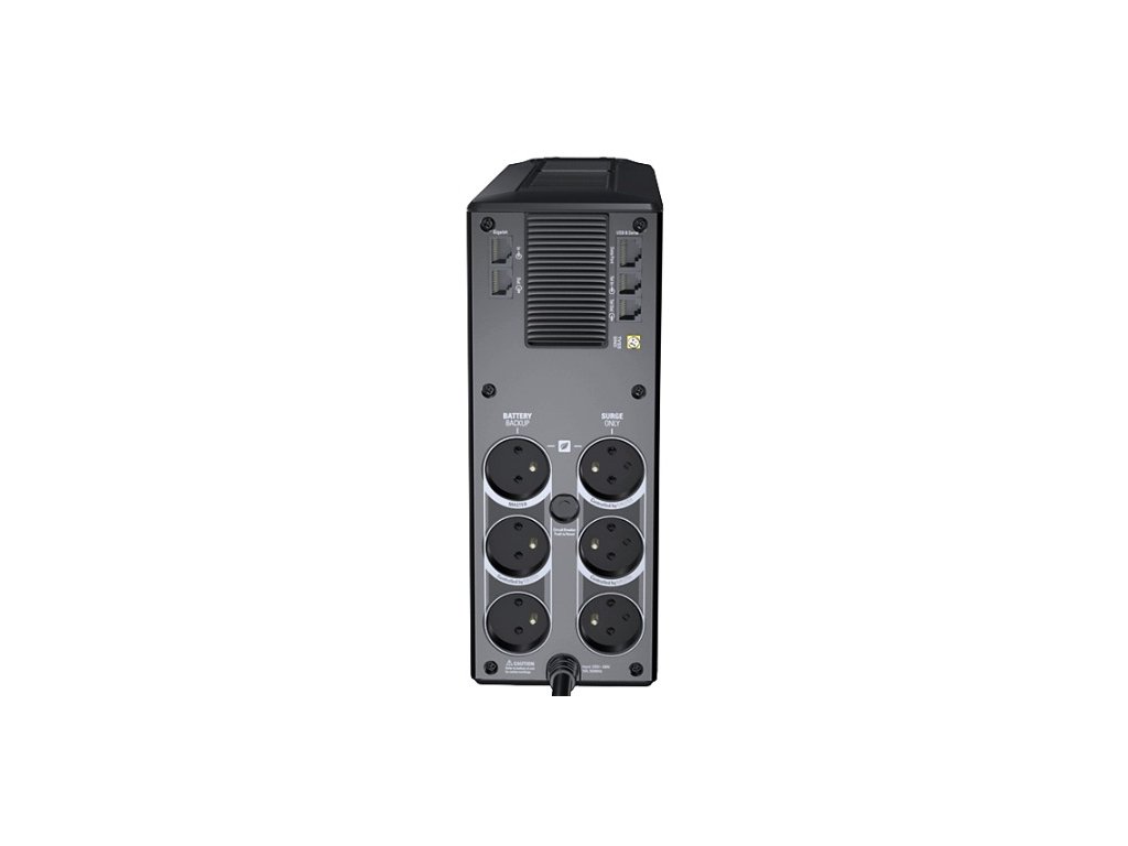 menej elektriny a ušetriť Vaše financie. Tento záložný zdroj má 6 výstupov z toho 3 na zálohovanie a 3 na prepäťovú ochranu a okrem toho obsahuje aj ochranu pre dátove linky. Predný panel obsahuje