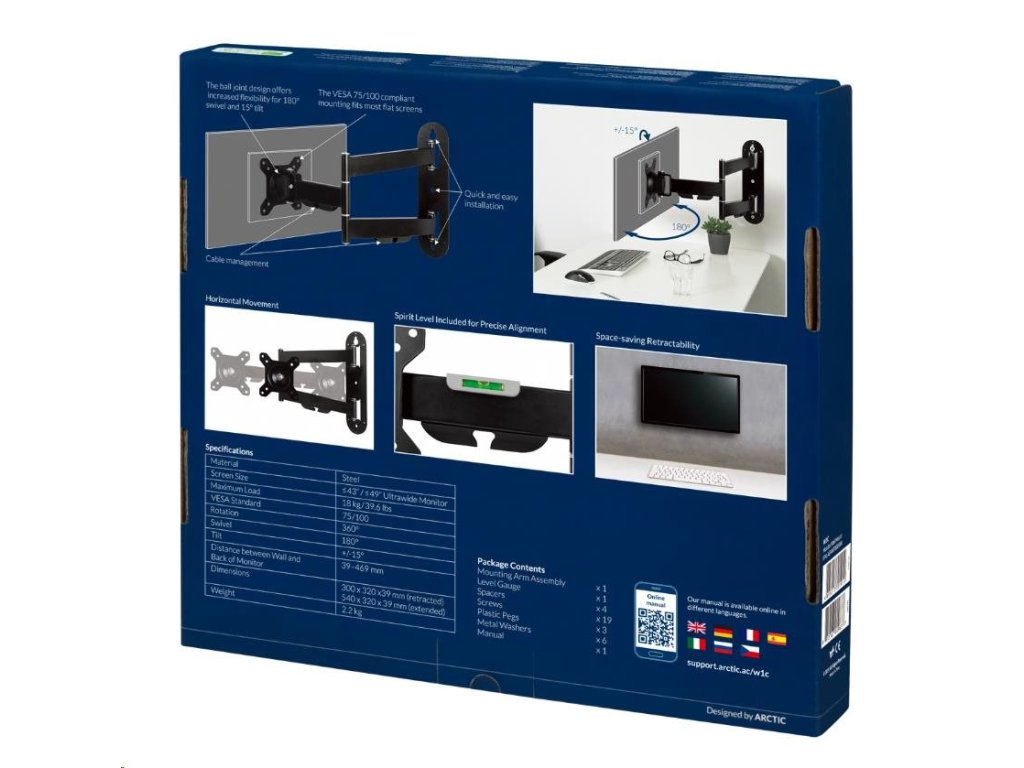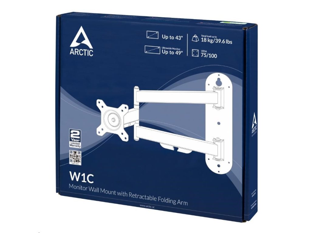 Nástenný držiak na monitor ARCTIC W1C bez problémov podporuje najnovšie ultraširokouhlé monitory (do 49 palcov). Kompatibilné sú aj klasické monitory s pomerom strán 16:9 (do 43 palcov). W1C unesie celkovú záťaž 18 kg/39.6 libier.