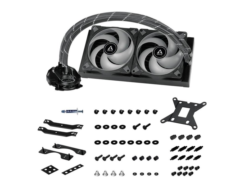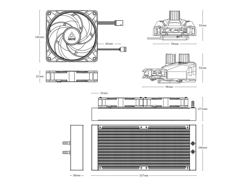 General Data Compatibility Intel Socket: 1700, 1200, 115X, 2011-3*, 2066* *Square ILM AMD Socket: AM5, AM4 Ram Clearance: unlimited Warranty: 6 Years Operating Ambient Temperature: 0—40 °C Connector: Cooler: 4-Pin PWM Connector LEDs: 4-Pin 5 V-Di-Gnd Connector Pump/Cold Plate VRM Fan: 40 mm, 1000—3000 rpm (PWM controlled) Pump: 800—2000 rpm (PWM controlled) Power Consumption: 0.5 W—2.7 W (Pump + VRM Fan) Cold Plate: Copper, Micro-Skived-Fins Thermal Paste: MX-5 (0.8 g) Fan Fan: ARCTIC P14 PWM A-RGB – 140 mm Fan x2 Fan Speed: 200—1900 rpm PWM Controlled (0 rpm below 5% PWM) Fan Bearing: Fluid Dynamic Bearing Noise Level: 0.3 Sone Voltage/Current: 0.17 A | 12 V DC Airflow: 68.9 cfm | 117,06 m3h Static Pressure: 2 mmH2O Connector: 4-Pin Connector RGB LEDs: 12 A-RGB LEDs per Fan Connector: 3-Pin 5 V-DI-Gnd Current/Voltage: 0.4 A/ 5 V Size & Weight Radiator: 317 (L) x 138 (W) x 38 (H) mm Pump (w/o tubes) 78 (L) x 53 (W) x 98 (H) mm Tube Diameter: Outer: 12.4 mm | Inner: 6.0 mm Tube Length: 450 mm Weight: 1600 g (Fan, Radiator, Pump, Tubes)Dodatočné parametre