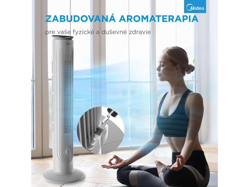 Vežový ventilátor, Vstavaná aromaterapia, Inteligentný program pre denné/nočné pohodlie s inteligentnou reguláciou úrovne vetra,Tenký dizajn, 3 režimy vetra simulujúce prirodzený/spánkový/normálny vietor,