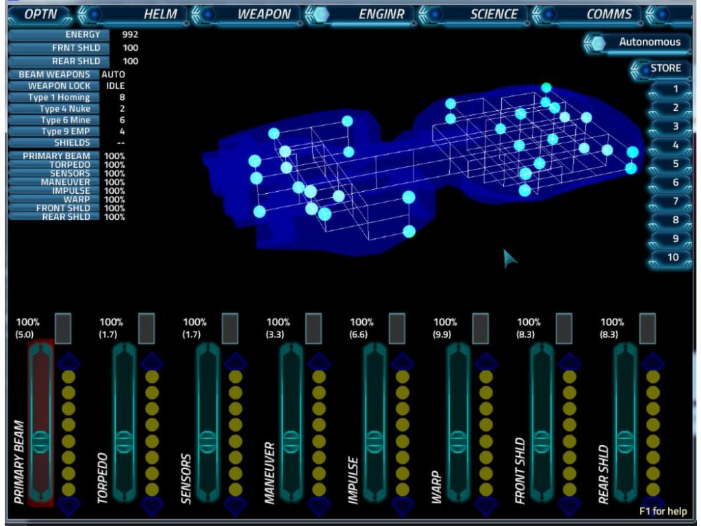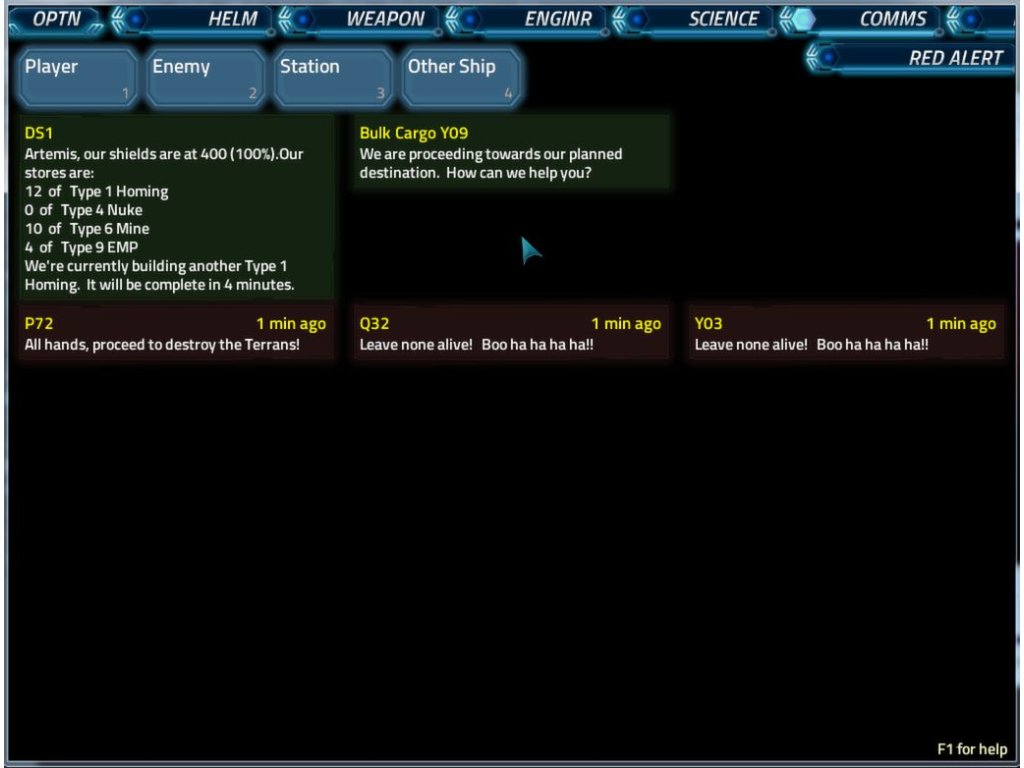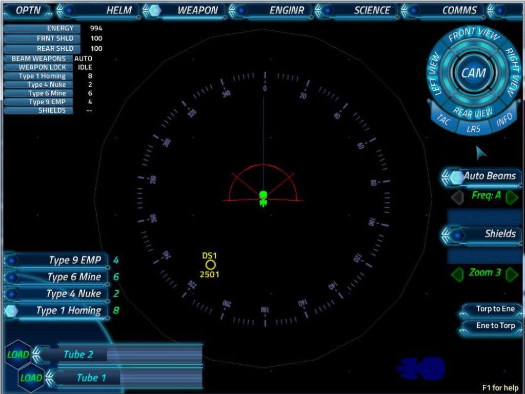 Artemis simulates a spaceship bridge by networking several computers together. You cannot play Artemis single-player! One computer runs the simulation and the "main screen", while the others serve as workstations for the normal jobs a bridge officer might do, like Helm, Communication, Engineering, and Weapon Control.