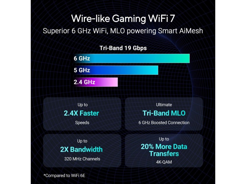 WiFi 7 (IEEE 802.11be) obsahuje všetky výhody WiFi 6/6E a rozširuje niekoľko súčasných štandardov WiFi na úplne novú úroveň, napríklad šírku pásma 320 MHz a 4K-QAM. Zavádza tiež niektoré revolučné funkcie, ako je napríklad prevádzka s viacerými linkami. Tieto kombinované technológie poskytujú nadštandardne vysoké rýchlosti, extrémne nízku latenciu a zvýšenú spoľahlivosť. Môžete si tak vychutnať bezkonkurenčné sieťové zážitky na akomkoľvek online bojisku.