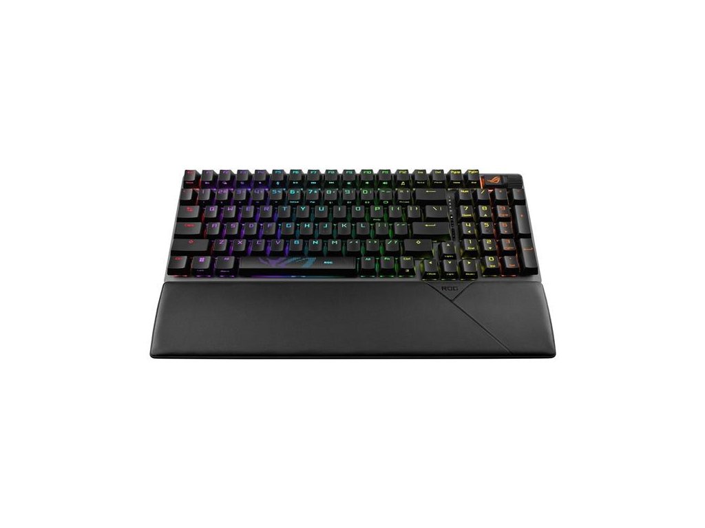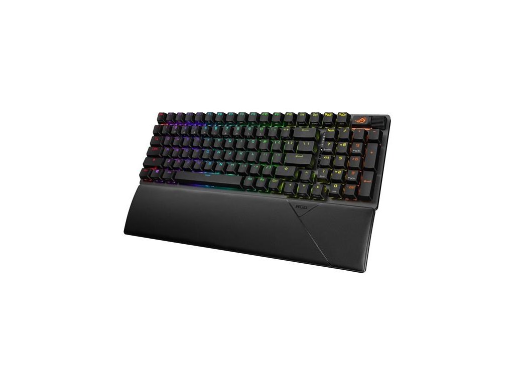 Bezdrôtová herná klávesnica ROG Strix Scope II 96 s pripojením v troch režimoch, klávesové skratky pre streamovanie, multifunkčné ovládacie prvky, mechanické spínače ROG NX s možnosťou výmeny za chodu, stabilizátory klávesnice ROG, krytky kláves PBT doubleshot a silikónová tlmiaca pena, tri uhly sklonu a opierka zápästia