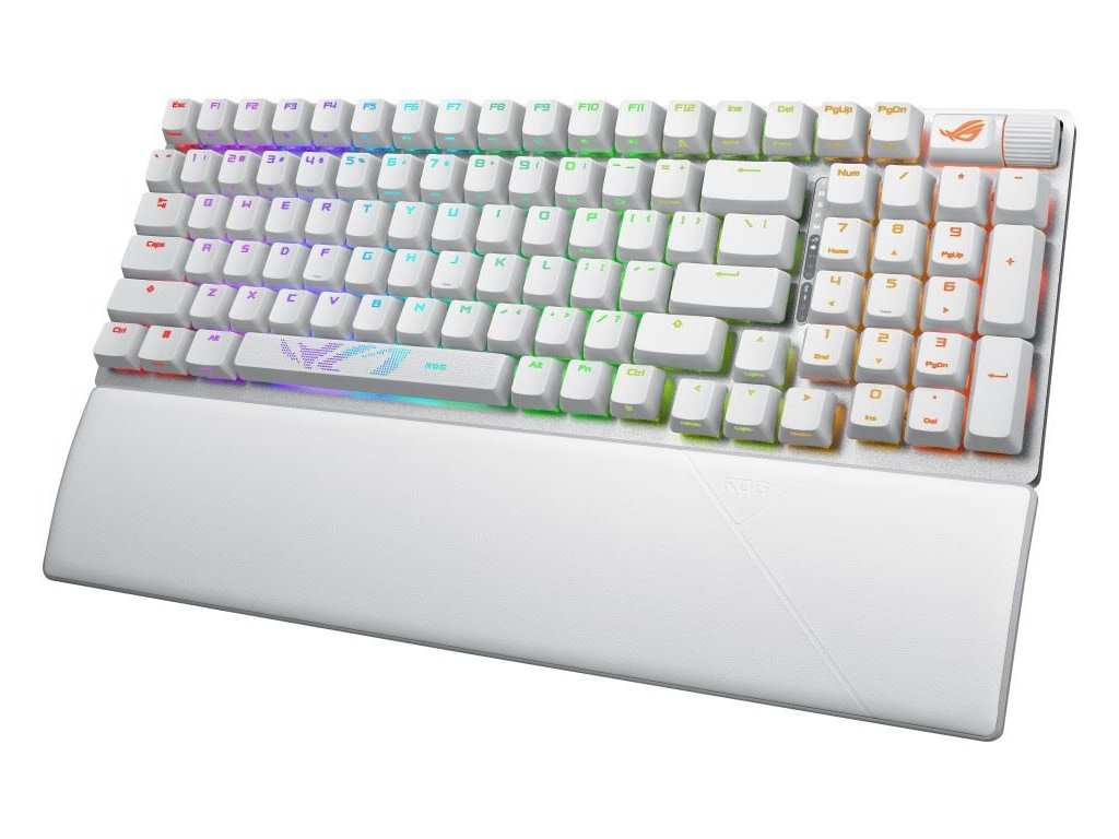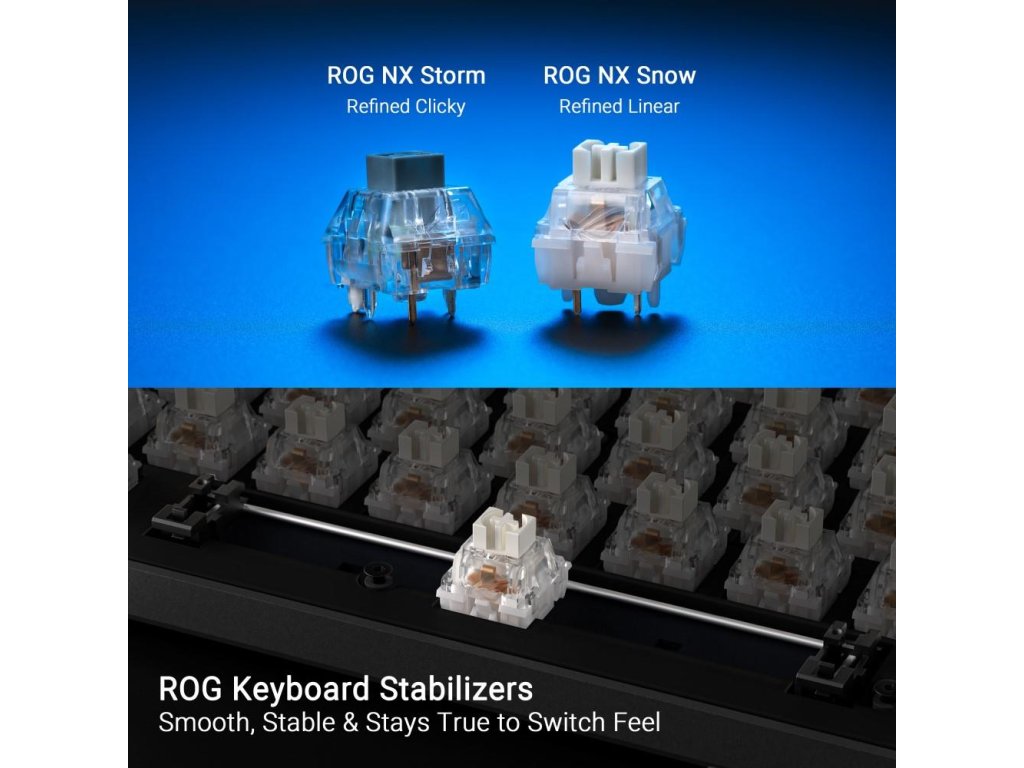 - Vylepšené možnosti písania: Predom namazané stabilizátory klávesnice produkujú menej trenia pre plynulejšie stlačenie kláves a stabilitu pre dlhšie klávesy; odolné krytky kláves ROG PBT doubleshot alebo krytky kláves ABS s UV vrstvou poskytujú prvotriedny pocit a odolnosť proti lesku