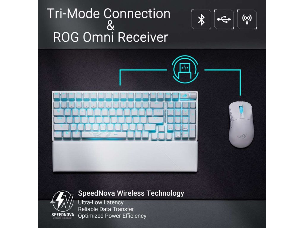 - Prvom režime pripojenia: Pripojte sa pomocou Bluetooth (až tri zariadenia), 2,4 GHz s bezdrôtovou technológiou ROG SpeedNova (až 1500 hodín výdrže batérie) alebo kábla USB prepínača vymeniteľného za chodu: Predom namazaný lineárny prepínač NX Snow so stienkovou konštrukciou, ktorá zvyšuje stabilitu a zabraňuje vnikaniu prachu