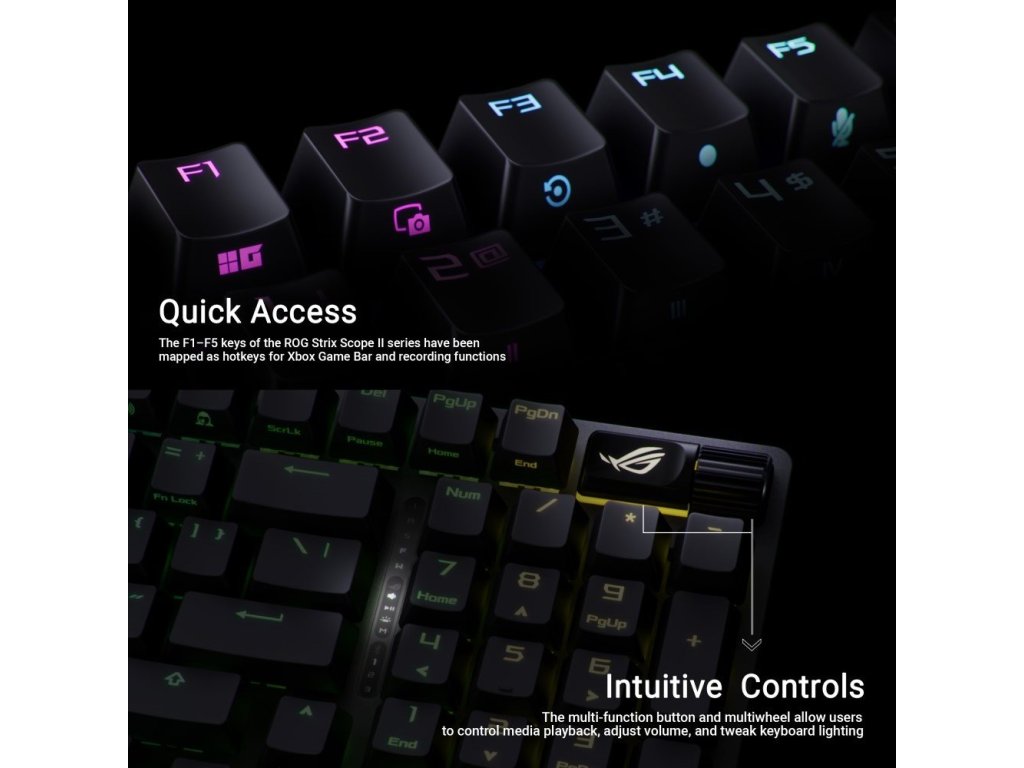 Bezdrôtová herná klávesnica ROG Strix Scope II 96 s pripojením v troch režimoch, klávesové skratky pre streamovanie, multifunkčné ovládacie prvky, mechanické spínače ROG NX s možnosťou výmeny za prevádzky, stabilizátory klávesnice ROG, krytky kláves PBT doubleshot a silikonová tlmená pena, tri uhly sklonu a opierka zápästia