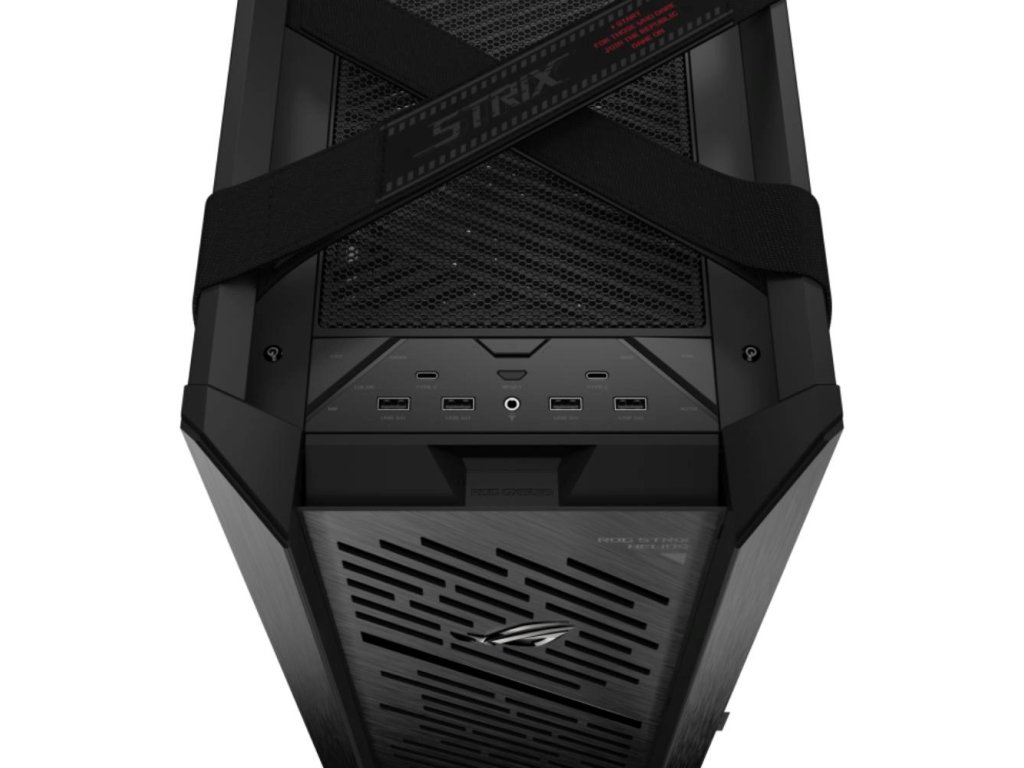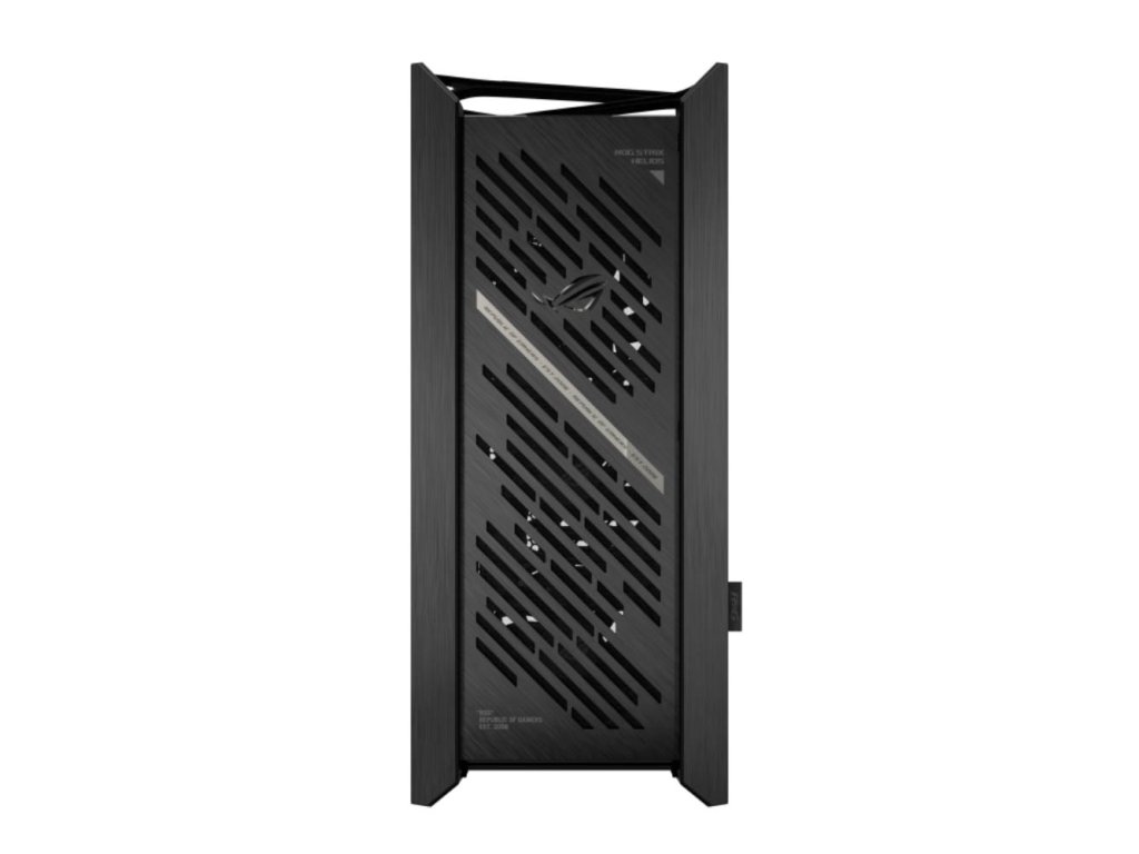 Herná skrinka ROG Strix Helios II EATX typu mid-tower s dvojitými bočnými panelmi z tvrzeného skla, podporou grafickej karty dlhšej až 450 mm, hliníkovým rámom a predným panelom, výstuhami pre grafickú kartu a podporou 420mm radiátora