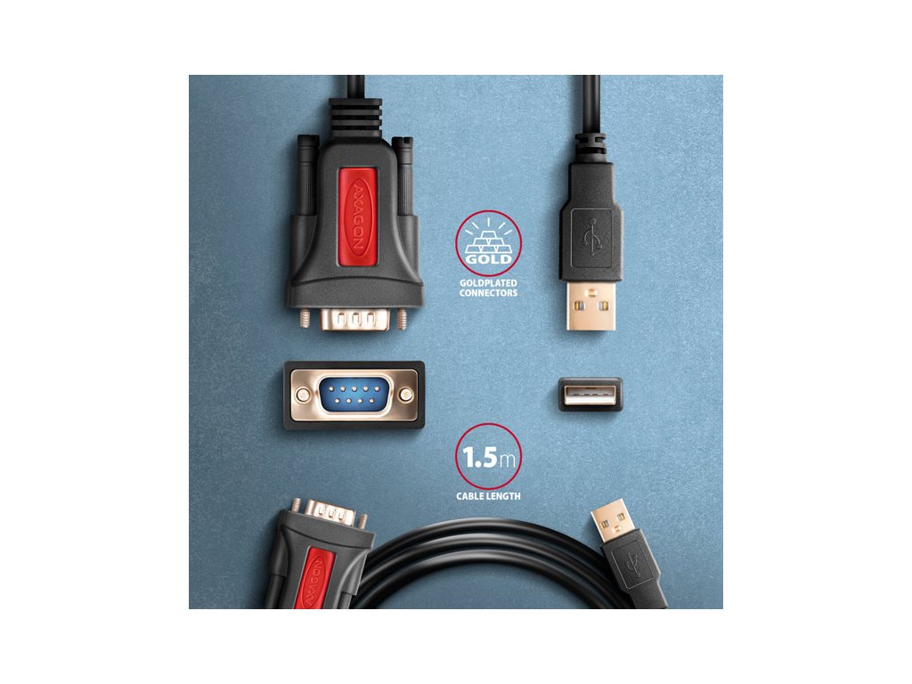 Pevne pripojený 1,5 m dlhý kábel USB-A je vhodný na použitie so stolným počítačom aj notebookom. Kábel je vybavený pozlátenými konektormi a kontaktmi, veľmi odolné telo adaptéra je vhodné aj pre priemyselné aplikácie. Dvojité tienenie chráni prenášané signály pred nepriaznivým rušením.