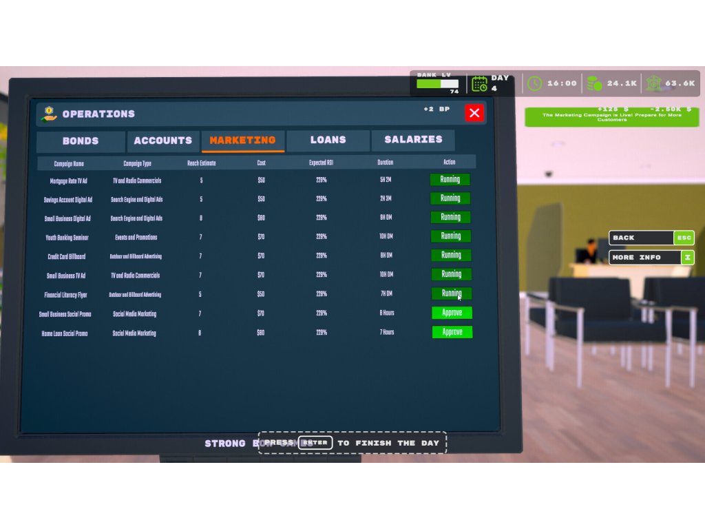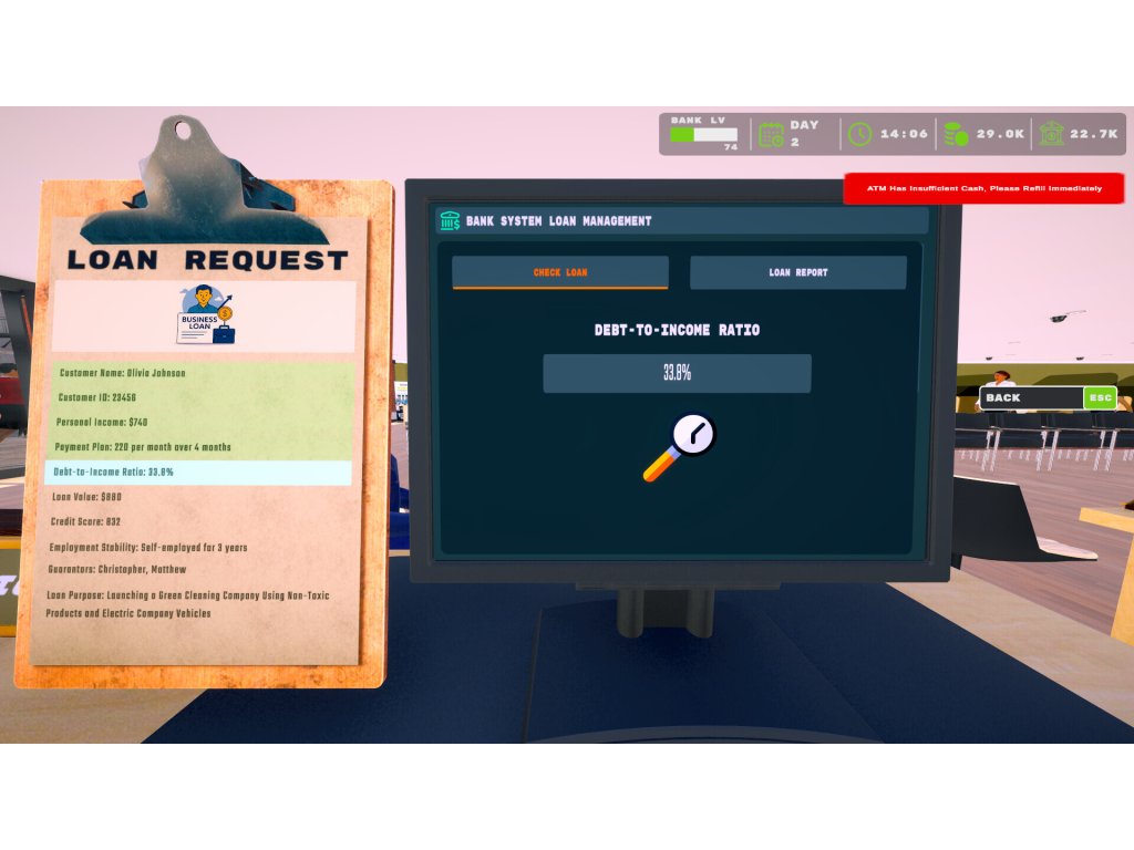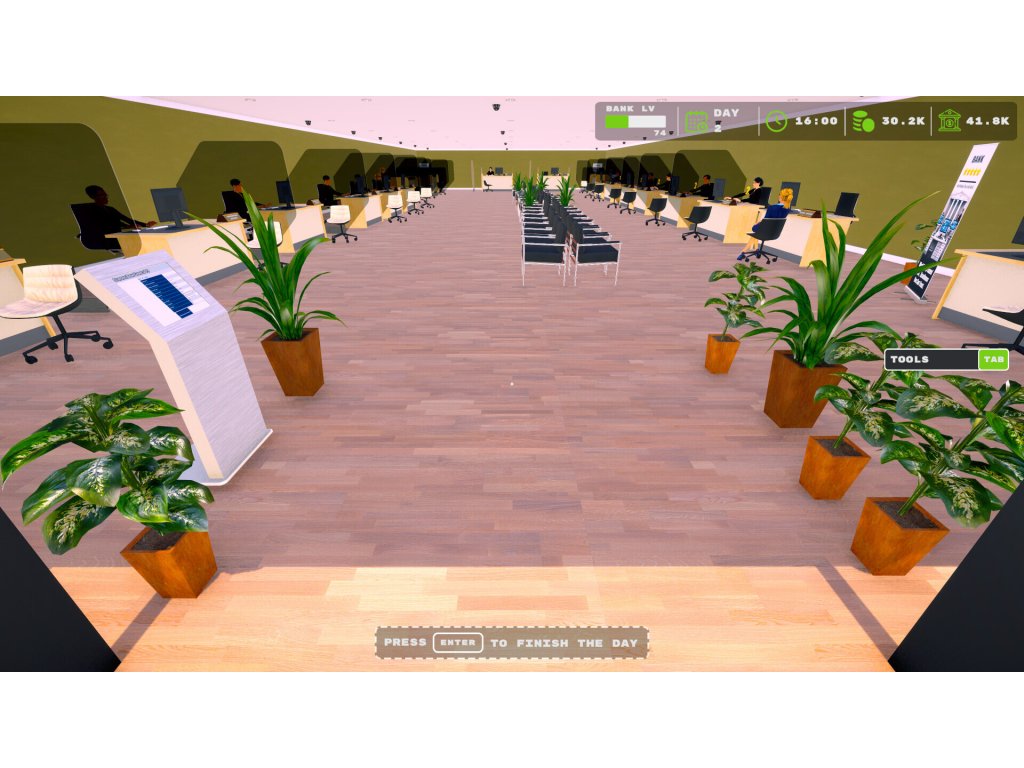 Bank Simulator is a realistic bank management game where you build, manage, and expand your financial empire. Hire staff, approve loans, invest in bonds, handle customer accounts, and run marketing campaigns, all while navigating financial challenges.