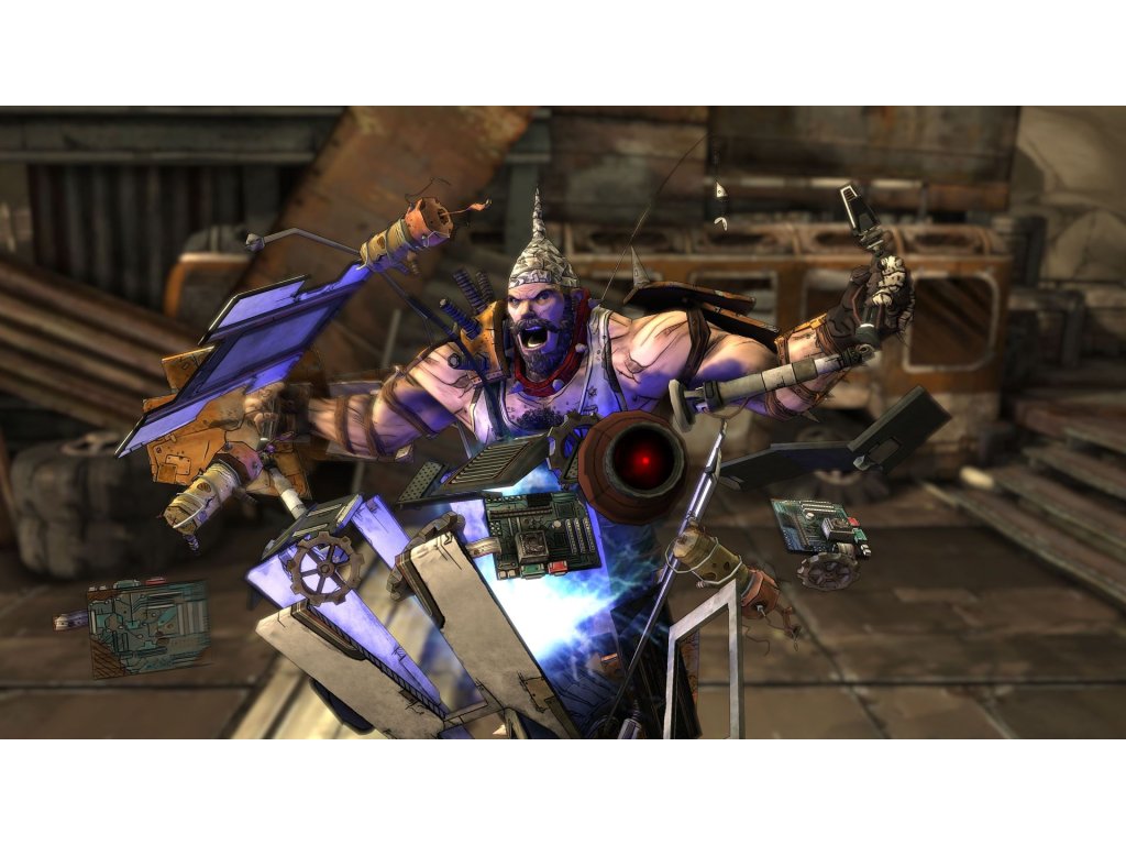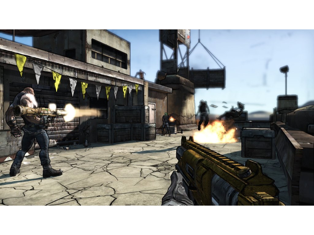 Bazillions of Guns: Rocket-launching shotguns, enemy-torching revolvers, SMGs that fire lightning rounds, and tons more. Radical Art Style: Traditional rendering techniques combined with hand-drawn textures give Borderlands its iconic style. Intense Vehicular Combat: Behind the wheel, engage in frenetic vehicle-to-vehicle combat. Co-op Frenzy: Whether online or together on the couch, tear through the opposition as a crew of up to 4.