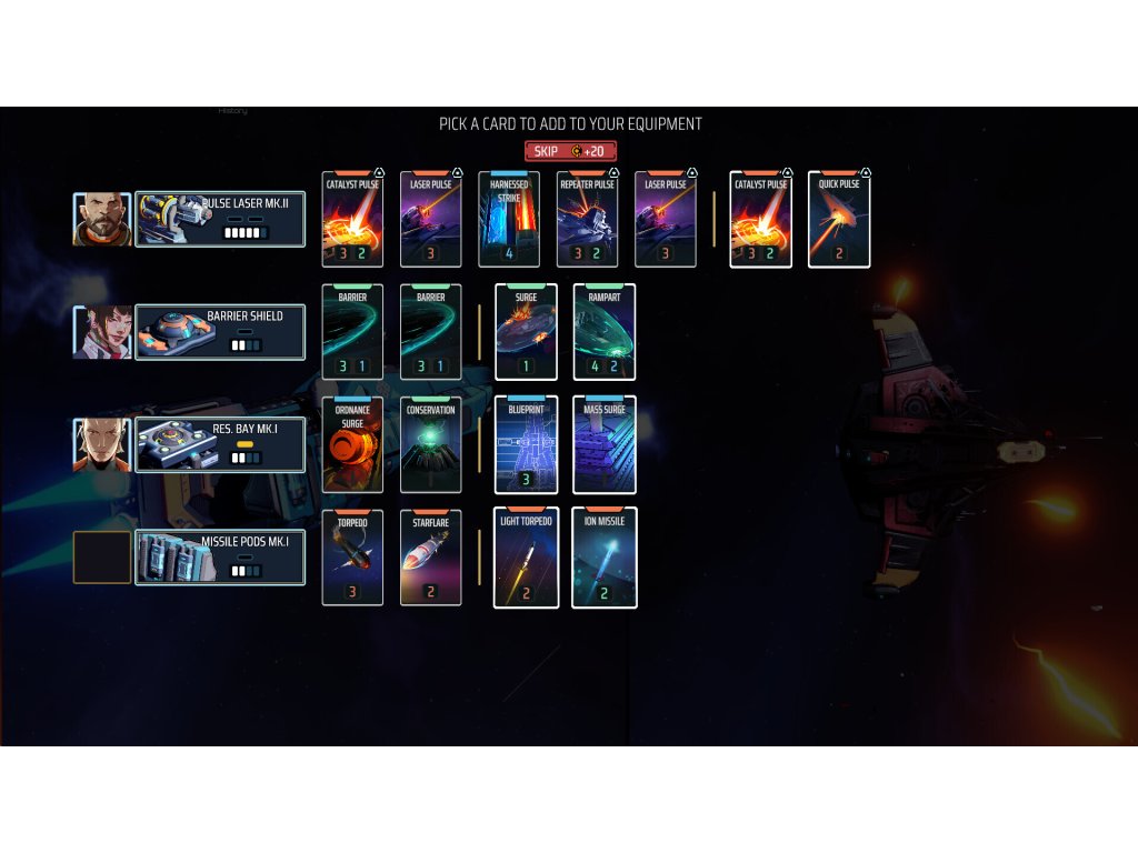 Seek out upgrades and new crew members as you traverse the galaxy – unexpected equipment combinations will provide powerful card synergies, each with their own risks and rewards.