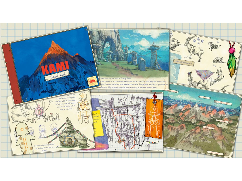 - Kami travel book: Marcel and Pontus’ latest attempt at climbing Mount Kami. This rugged little guide includes tips, sketches, and a recounting of what they saw up there. Illustrated by comic artist & game art director Mathieu Bablet. 30 pages, English & French.