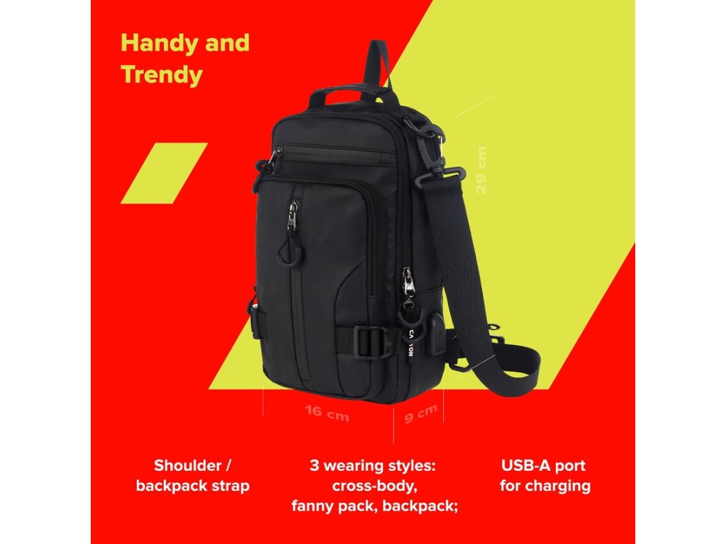 Mestská taška / batoh TransformerBatoh Canyon CB-1 Transformer sa stane vaším obľúbeným každodenným spoločníkom! S kapacitou 3,5 l je kompaktný, pohodlný a všestranný. Noste tašku na ramene alebo ako batoh vďaka inteligentne nastaviteľnému popruhu. Nespotíte sa - zadná strana je vetraná. Tri vnútorné a tri vonkajšie vrecká vám umožnia úhľadne zorganizovať každodenné nosenie. Aj keď prší, tento batoh Transformer nenechá vaše veci zmoknúť - materiál, ktorý sme použili, je vodeodolný.