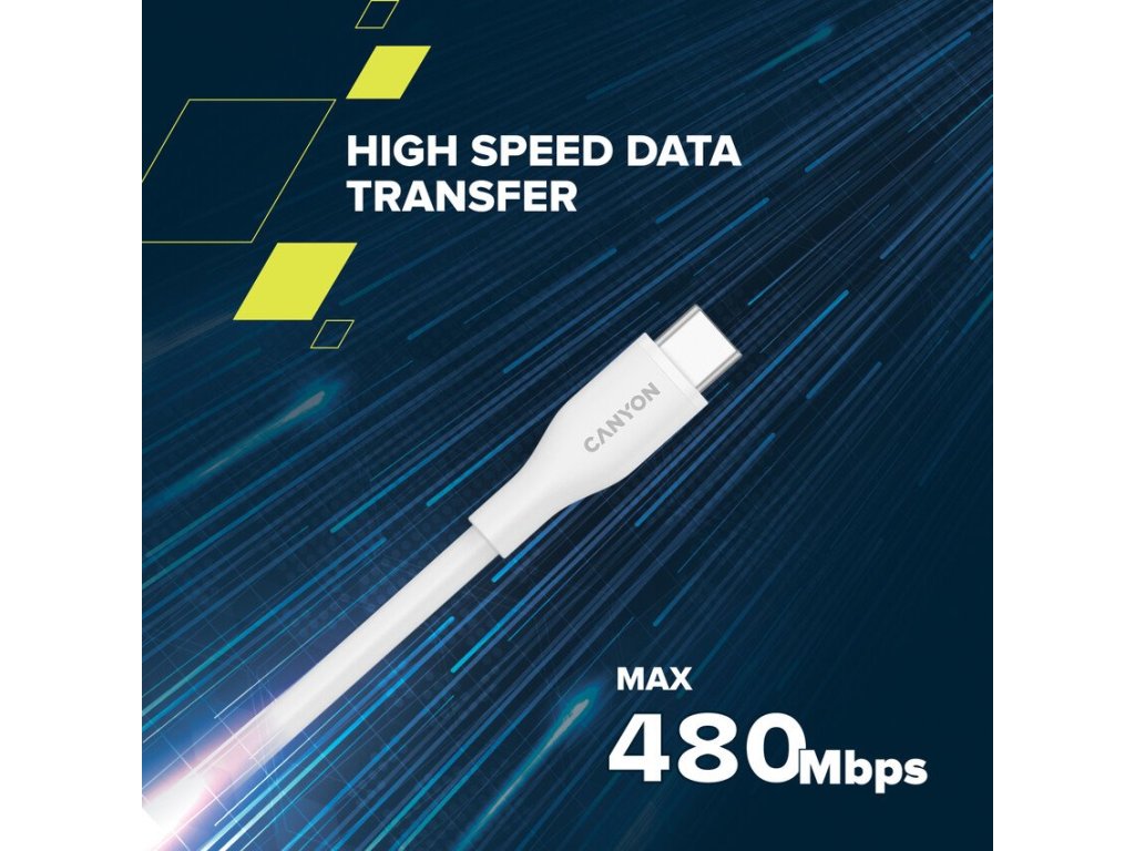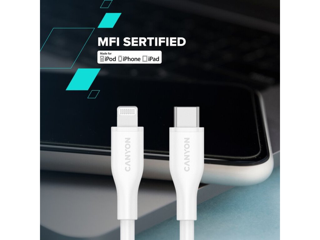 Canyon CLNM60SC10, 1 m kábel, USB-C / Lighting, MFi Apple schválený, 60 W, 480 Mbps, silikónový, biely