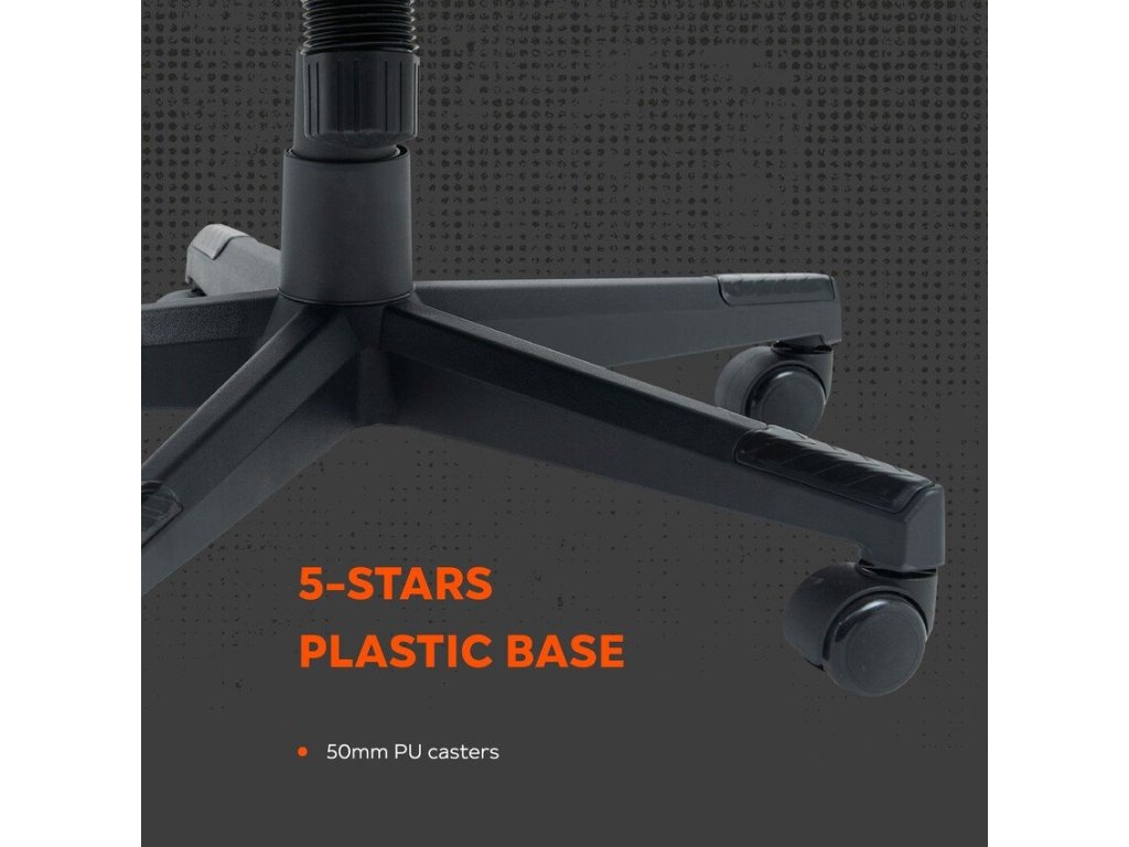 Päťhviezdičková nylonová základňa udržiava rovnováhu vďaka tichým 50 mm kolieskam, ktoré sa kĺžu bez námahy. Budete sa pohybovať hladko a ticho - jediná vec, ktorá by mala robiť hluk je váš víťazný pokrik. Vďaka plynovému zdviháku triedy 4 si môžete výšku stoličky prispôsobiť podľa svojich predstáv na dokonalú úroveň. Už žiadne nepríjemné hrbenie sa nad stolom!