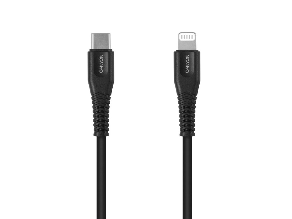 Canyon MFI-4, 1.2m kábel USB-C / Lightning, MFi Apple schválený, 5V/2.4A, priemer 3.5mm, PVC, čierny