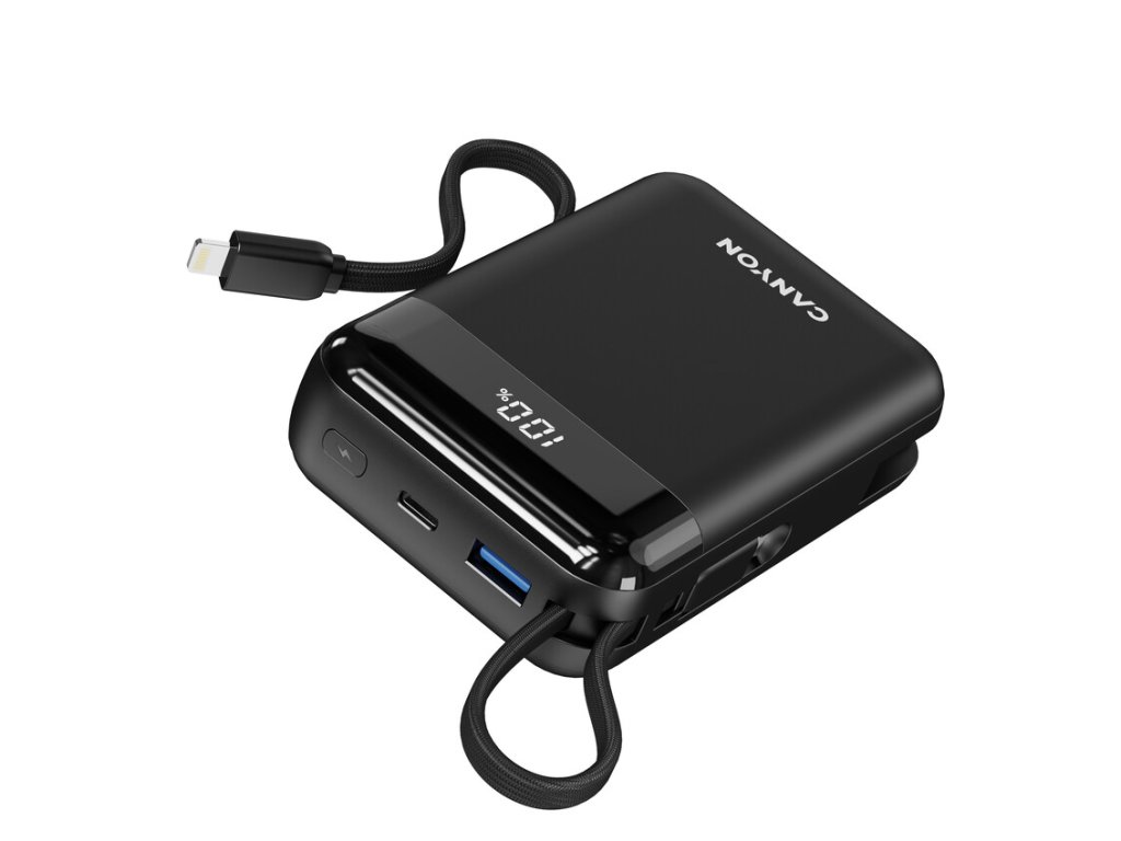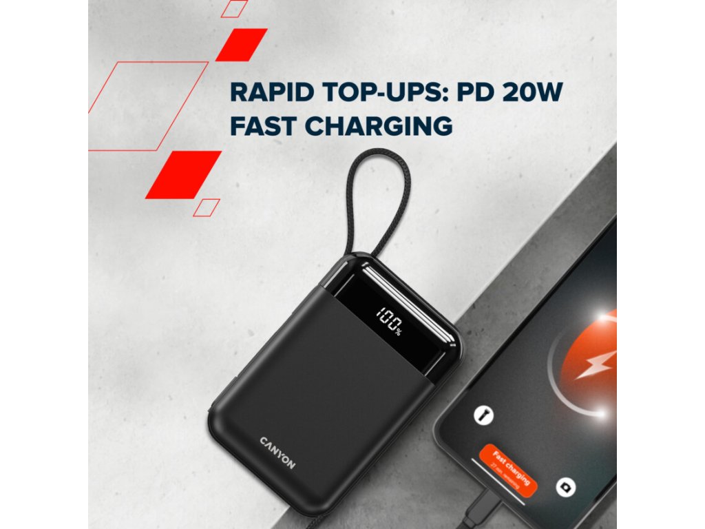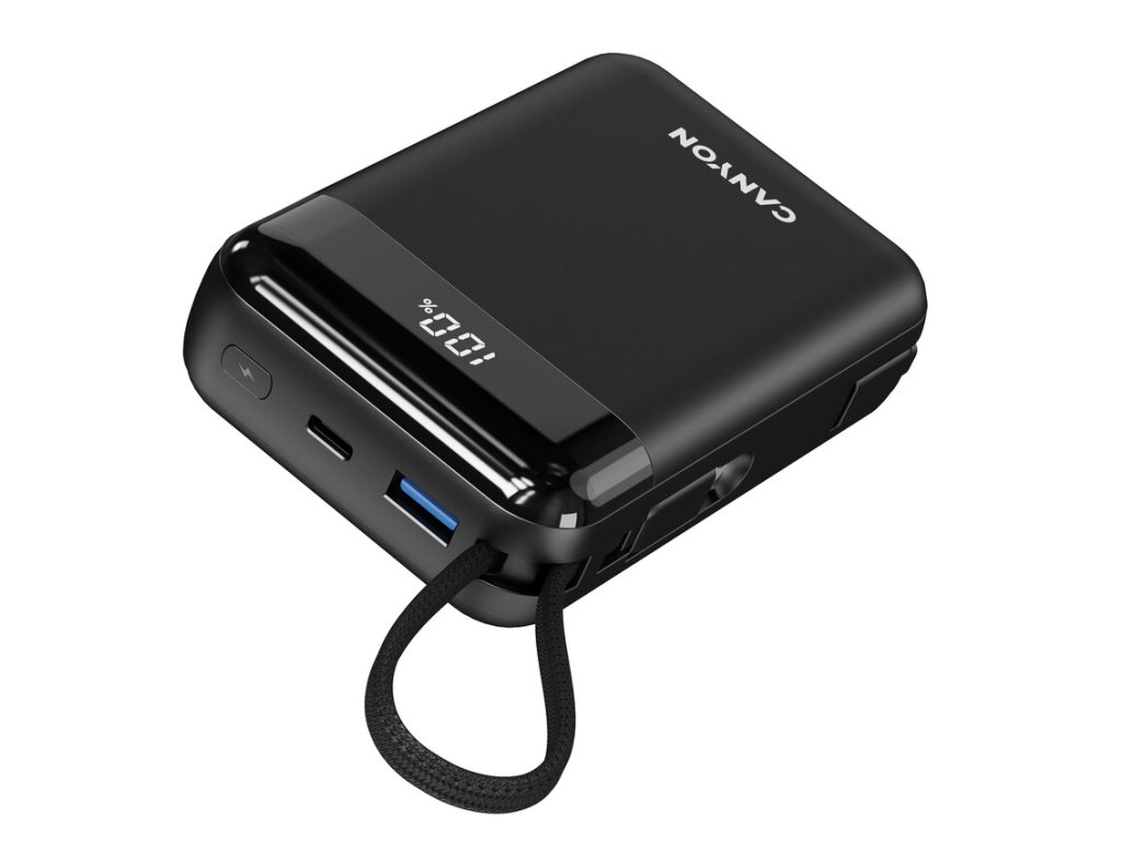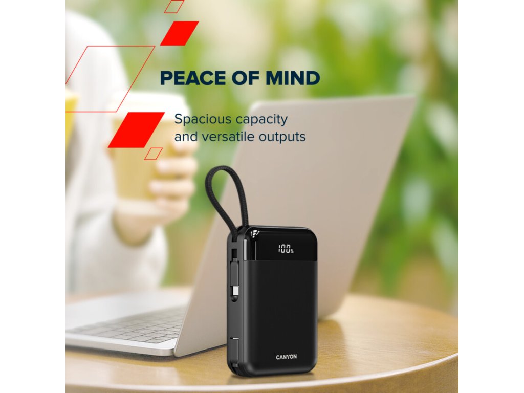 Canyon OnPower 204, Powerbanka, 20 000 mAh, 22.5 W, in/out: USB-C/USB-A, integr. káb. Ligtning+USB-C