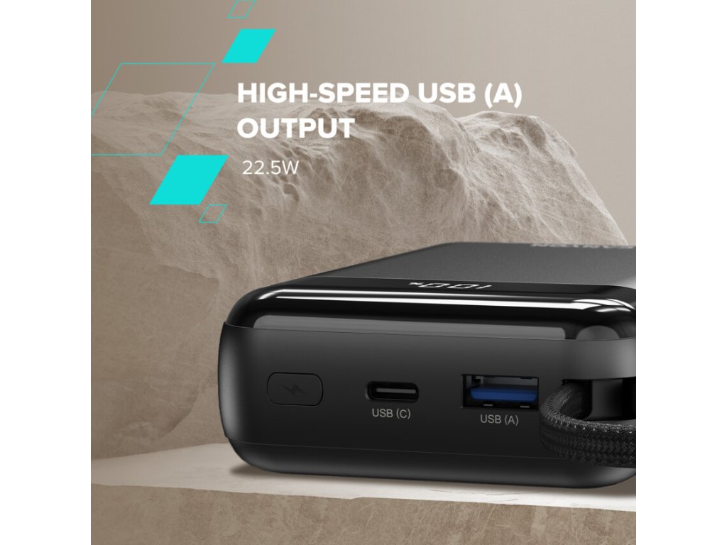 - Porty: 1× USB-C, 1× USB-A + vstavané káble USB-C a Lightning