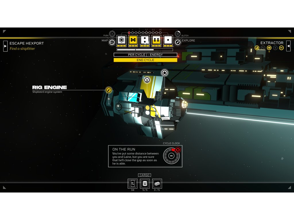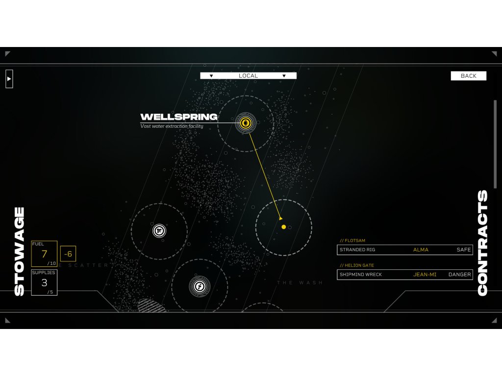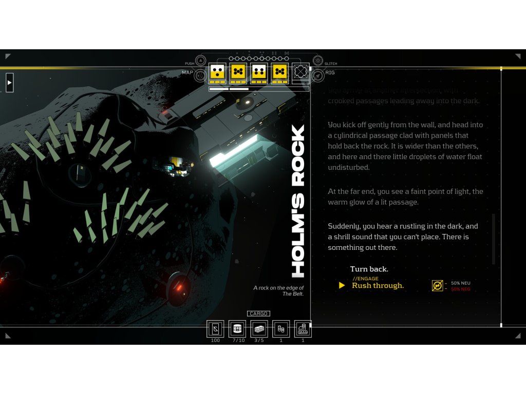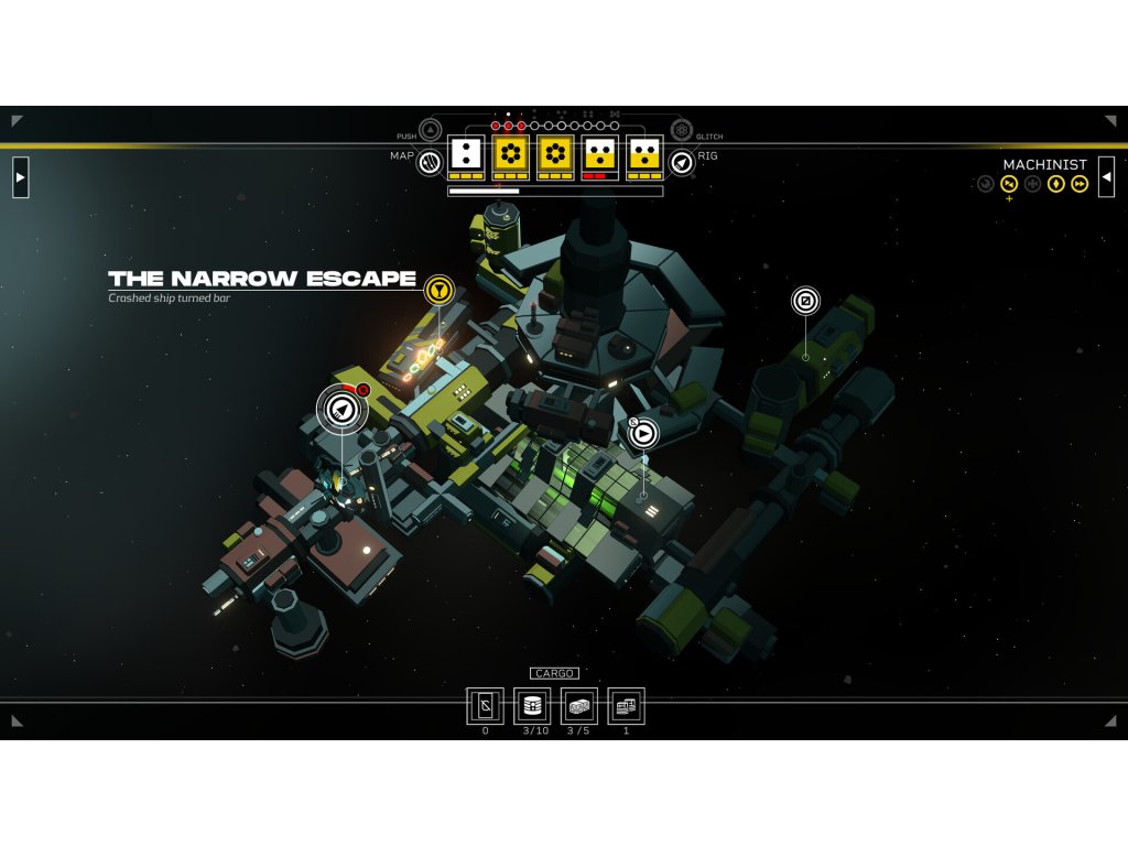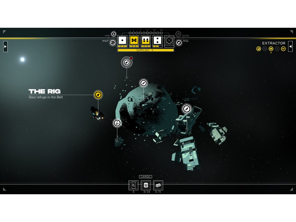 The ship you stole. It’s a ragged old Rig that’s seen better days, but it’s all you’ve got. Upgrade your ship to extend its range, reach new locations and turn it from a hovel to a home.