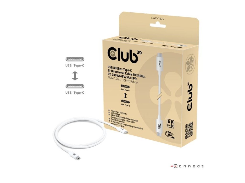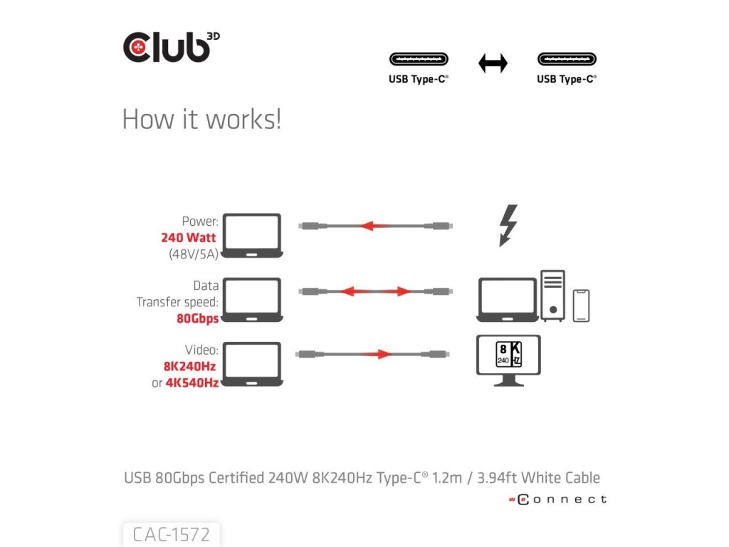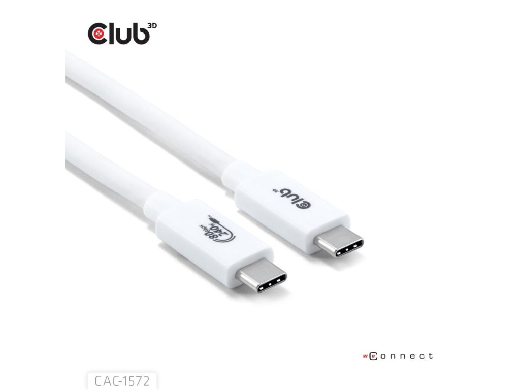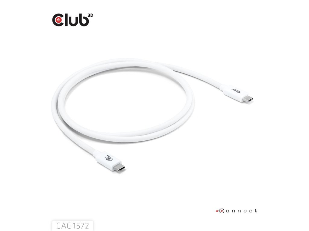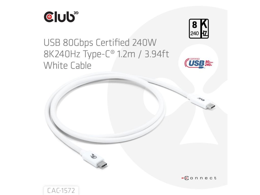 Club3D Kabel USB4 Typ-C, 80Gbps, Certifikovaný kabel, 4K540Hz, 8K240Hz, 16K60Hz, PD 240W, 1.2m, bílá