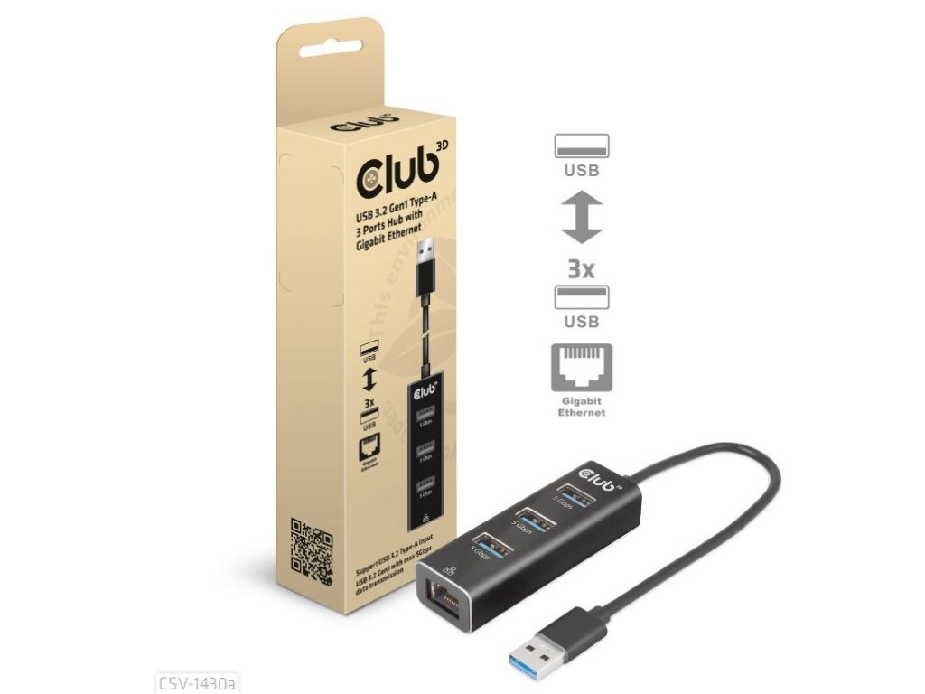 Club 3D CSV-1430a je rozbočovač USB 3.2 Gen1 Type-A so 3 portami s gigabitovým Ethernetom a je navrhnutý štýlovým spôsobom a veľmi tenký, takže sa ľahko prenáša. CSV-1430a vám umožňuje súčasný prístup k 3 portom USB 3.2 Gen1 Type-A a portu Ethernet 10/100/1000 z jediného up-linku USB 3.2 Gen1 Type-A. Zariadenie je spätne kompatibilné so štandardom USB 2.0, no to bude mať vplyv na výkon. Všetky 3 porty USB sú kompatibilné s USB Type-A a USB 3.2 Gen1 s prenosom dát max. 5 Gb/s. Ethernetový port je kompatibilný s Gigabit Ethernet 10/100/1000 (RJ45) a plne duplexný s riadením toku.
