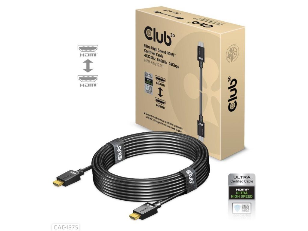 Club 3D CAC-1375 Ultra High Speed HDMI™2.1 Certifikovaný kábel je skonštruovaný tak, aby zvládol najvyššiu kvalitu video- a audio- signálov.