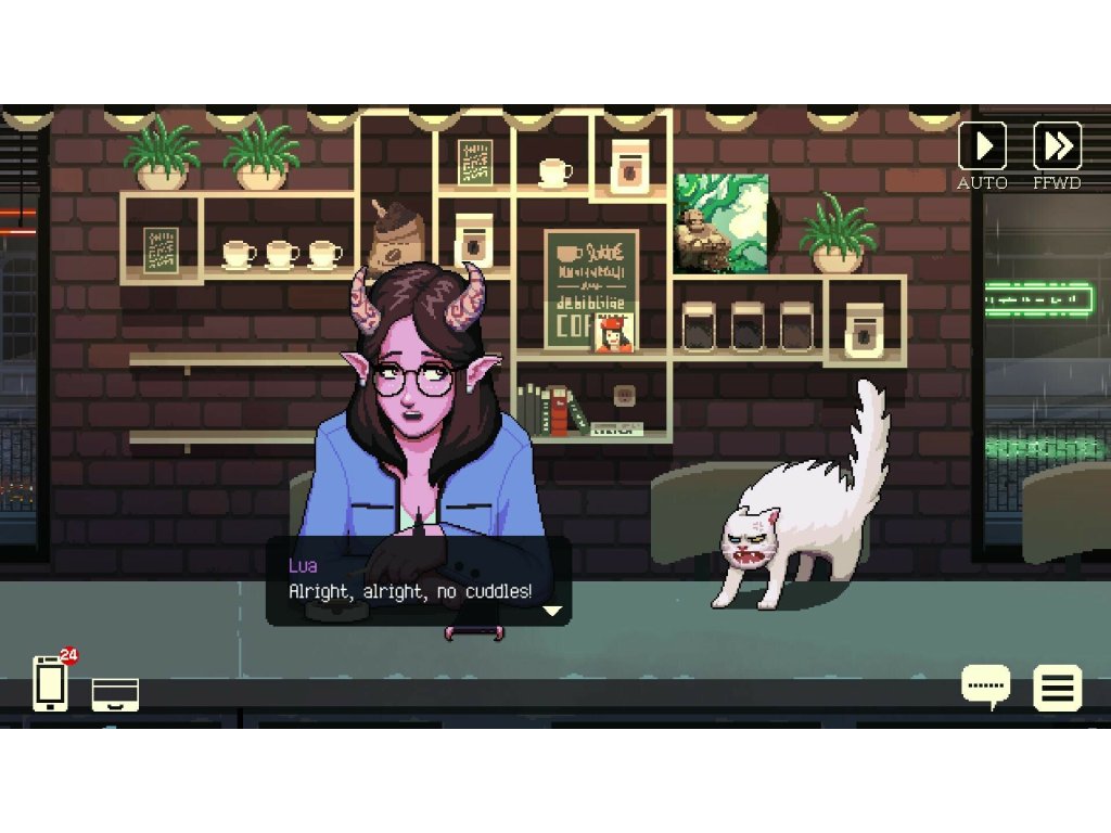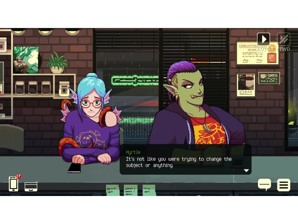 Meet quirky and interesting characters, such as; Baileys the elf freelance graphic designer, Lua, the succubus bisdev executive, Myrtle the orc game developer, and more. Listen to their stories and influence them with a warm drink or two!