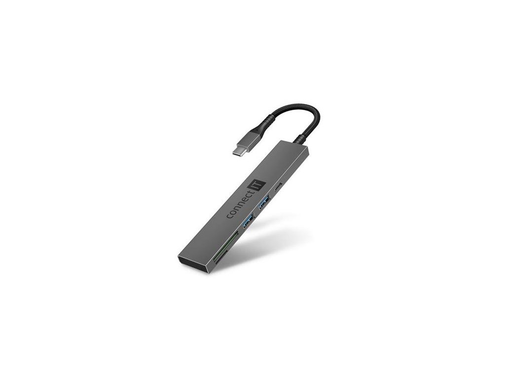 CONNECT IT CompactPRO USB-C hub + čtečka karet, (2xUSB-A 3.0, 1xUSB-C), externí, ANTRACITOVÝ CompactPRO 5IN1 ANTHRACITE --- Prakticky tvarovaný USB-C hub pro připojení až 3 USB periferií (1 x USB-C a 2 x USB-A), 1x SD karty a 1x MicroSD karty. Umožní připojení např. myši, klávesnice, MP3 přehrávače, scanneru, tiskárny, digitálního fotoaparátu, externího pevného disku, flashdisku atd. --- Jedná se o výborný doplněk běžných stolních počítačů i přenosných notebooků, které nemají dostatek vlastních USB portů. Díky svým rozměrům se jedná o ideální příslušenství na cesty jako příslušenství k notebookům. Pro připojení k počítači je určeno rozhraní USB-C. Napájený je z USB portu počítače nebo notebooku, tudíž nepotřebuje žádné další napájení. K hubu můžete připojit jakékoli zařízení standardu USB 3.0, 2.0 nebo 1.1 jako jsou myš, klávesnice, MP3 přehrávač, scanner, tiskárna, digitální fotoaparát, externí pevný disk, flashdisk atd. Hub má také čtečku SD a micro SD, což jistě využijí fotografové, ať už profesionální, nebo lidé, kteří mají fotografování jako koníček. --- Rozšiřuje USB-C port o další dva USB-A porty (3.0) a jeden USB-C port Čtečka paměťových karet 1x SD a 1x MicroSD Určen pro domácí i kancelářské profesionální použití 2x USB-A port 3.0 gen. 1 s přenosovou rychlostí 5 Gbps 1x USB-C port přenosovou rychlostí 10 Gbps Snadná instalace Plug & Play bez nutnosti instalace a stahování ovladačů (stačí pouze připojit k USB portu počítače nebo notebooku) Podpora připojení 2.5" disků bez nutnosti přídavného napájení Kompatibilní s operačními systémy Windows a Mac OS (funkce produktu, které nejsou podporovány Mac OS, nemusí fungovat správně) Délka kabelu (bez konektoru): 12 cm Rozměry bez kabelu (d × š × v): 115 x 23 x 8 mm Hmotnost: 30 g Materiál: hliník Barva: antracitová --- Obsah balení: USB hub Návod k obsluzeDodatočné parametre