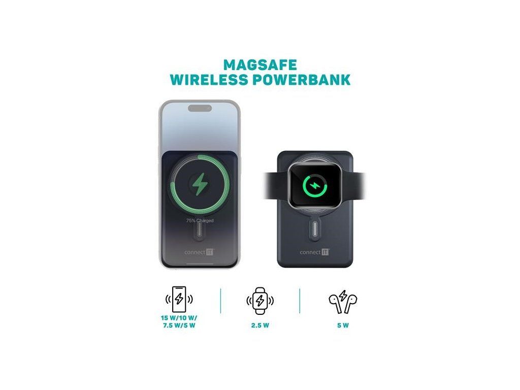 Bezdrôtová MagSafe powerbanka s kapacitou 10000 mAh kompatibilná s Apple iPhone a Apple Watch. Disponuje integrovaným USB-C a Lightning káblom. Podporuje až 20 W rýchlonabíjanie pomocou USB-C kábla.