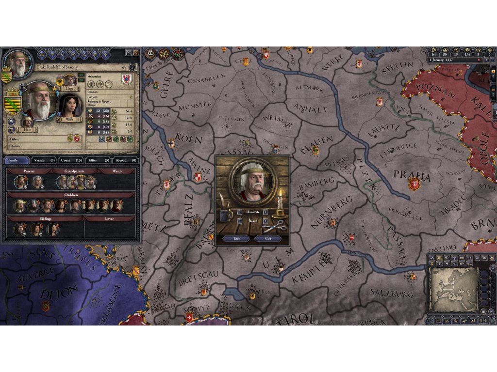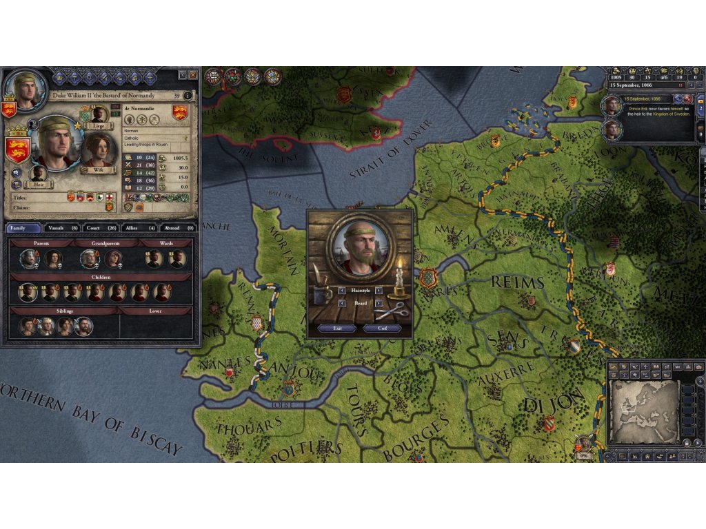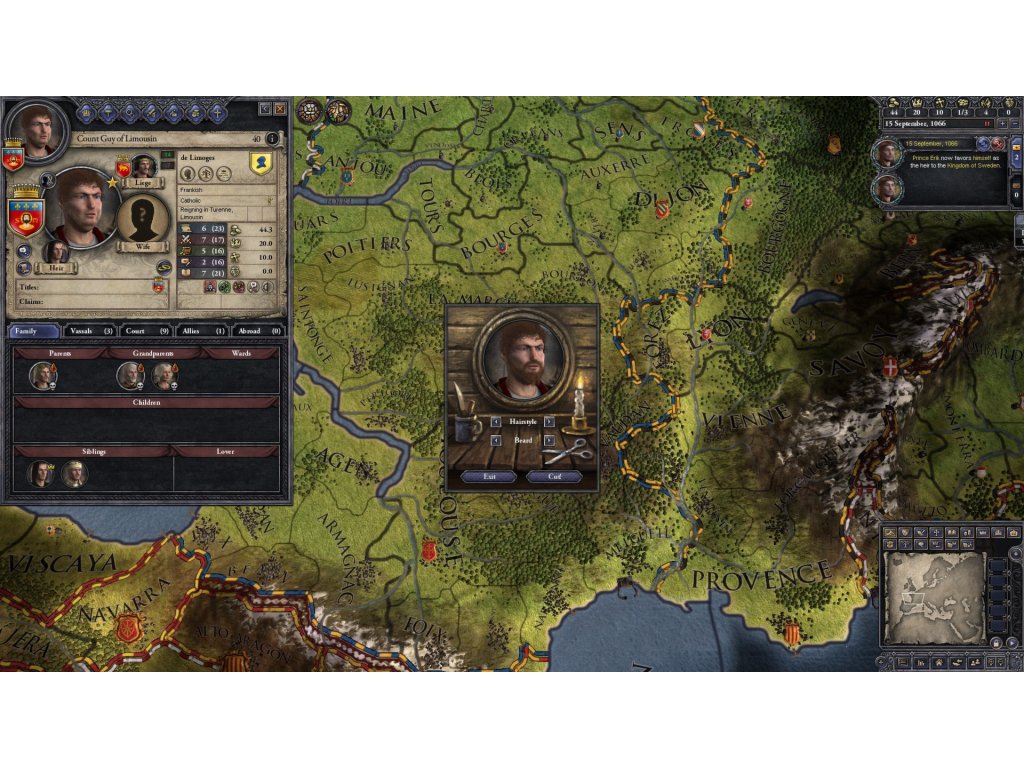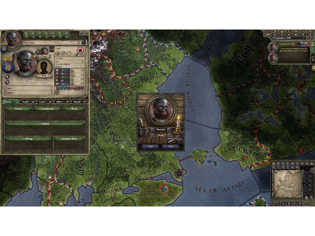 Do you think your character has an ugly beard? Trim it! (And get a haircut while you're at it...) Want to change the name of your kingdom to 'Awesomia'? Do it. Does your faithful vassal have a stupid dynasty name or shield? Customize them! The Customization Pack allows you to alter all of these things in-game. It has no effect on gameplay, but perhaps on your peace of mind.