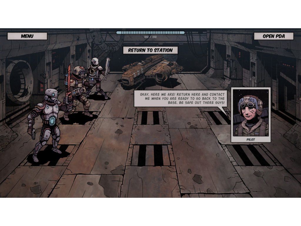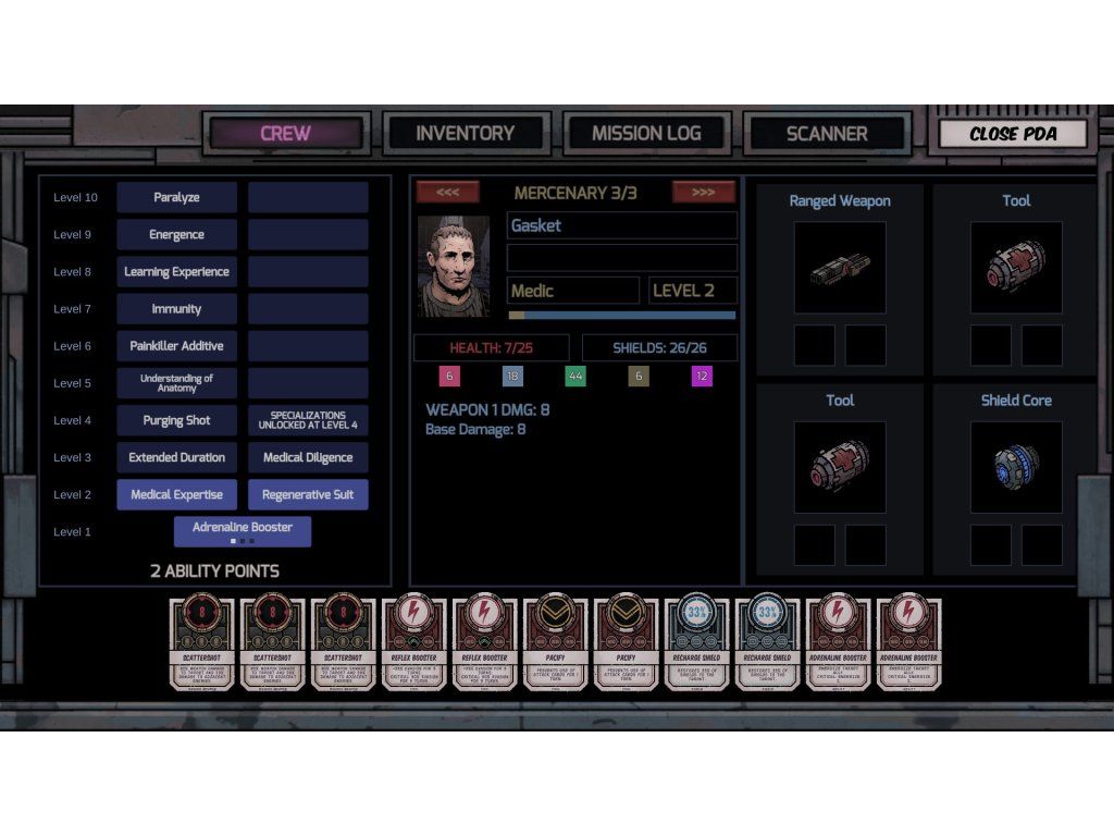 Build and control a squad of up to three mercenary characters and set on to explore derelict ships within your reach from the scavenger's base. Searching the derelicts for loot and clues, you come across many friendly inhabitants and traders, but more often – various enemies. Challenge and defeat them in tactical turn-based fights, where randomly-drawn cards form your changing arsenal of combat actions, gain experience for yourself and your crew, loot dead bodies, resupply and upgrade once back at your base. The scavenger's home ship gives you the opportunity to heal and level-up your mercenaries, recruit new ones, equip them, upgrade their gear or recharge energy for life support during missions.
