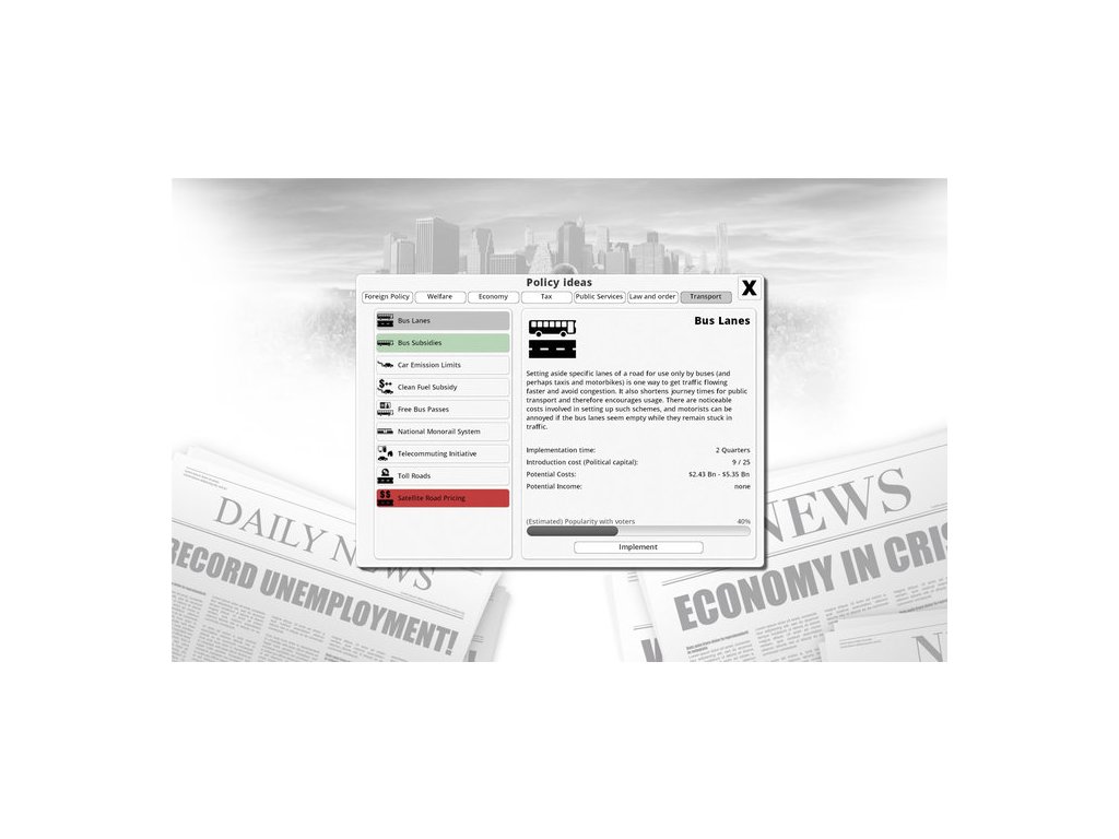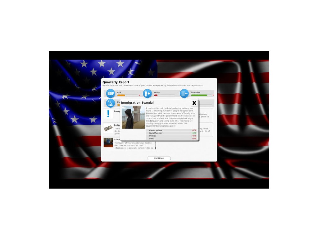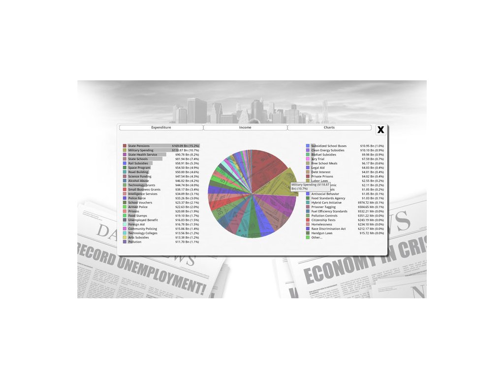 Crime, unemployment, national debt, terrorism, climate change. Have you got the answers to the problems that face western industrialized nations? Here is your chance to find out. Democracy 3 simulates the motivations, loyalties, and desires of everyone in the country. A custom designed neural network is used to model individual voters, each with varying memberships of voting groups, political parties, and pressure groups. Each voter's income is modeled, along with their levels of complacency and cynicism. This is the most sophisticated political strategy game ever created.