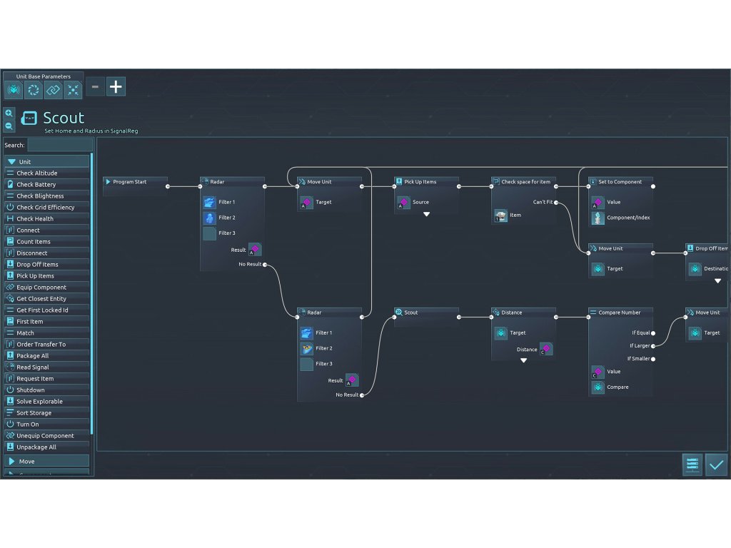 Fully Customizable Units: Desynced uses drones instead of belts. Equip them with tools fit for their purpose, or program advanced behaviors using a drag and drop editor. Tailor units to your playstyle and adapt to the challenges that await.