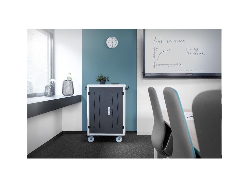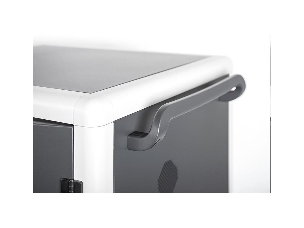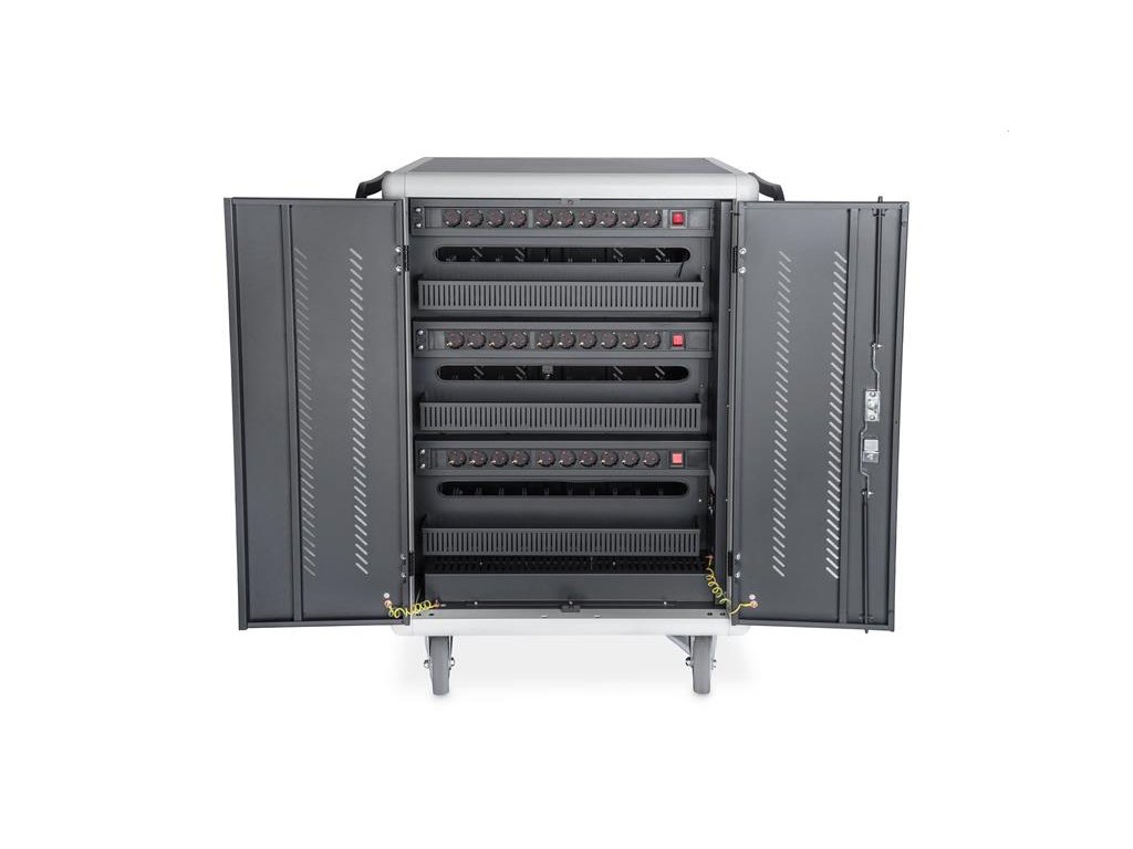 Nabíjecí vozík pro notebooky a tablety, 30 nabíjecích základen, černý 1100 x 700 x 600 mm, vč. USB, PDU, ventilátor Ideální řešení pro ukládání a nabíjení přenosných zařízení. 30 stanic (3x10) 40 x 300 mm pro zařízení (vhodné až pro 15,6 " zařízení) 30 x připojení USB 3 x zásuvka na zadní straně (10 x bezpečnostní zdířky včetně spínače) Průchodka kabelů a možnost uložené rezervy kabelů na každé úrovni Kompaktní box, mobilní díky nainstalovaným kolečkám - dvě s brzdou proti nechtěnému posunu. Mobilní nabíjecí skříň od společnosti DIGITUS® je ideálním a kompaktním řešením pro ukládání a nabíjení přenosných zařízení, jako jsou notebooky a tablety. Mobilní nabíjecí skříňky se často používají ve veřejných zařízeních, jako jsou školy, aby bezpečně ukládaly zařízení na centrálním místě a současně je nabíjely. Skříňka obsahuje 3 řady s 10 nabíjecími stanicemi, z nichž všechny mají na přední straně své vlastní připojení USB. Zařízení lze také připojit s nainstalovanými zásuvkovými lištami (3 x 10 bezpečnostních zdířek) na zadní straně. Díky dostatečným průchodům a možnosti uložení kabelů je zaručena optimální správa kabelů. Nainstalované ventilátory (3 x 24 V) v kombinaci s větracími štěrbinami zajišťují aktivní chlazení skříně. Technické údaje Dvojité skládací přední a zadní dveře Klička s otočnou rukojetí páky na předních a zadních dveřích, uzamykatelná Úhel otevření dveří 180 ° Dvoubodové zamykání (tyčový zámek) Včetně 4 koleček (2 uzamykatelné) Včetně úchytů pro lepší mobilitu (přiloženo) Hloubka vnitřní přihrádky: 415 mm (vhodné pro zařízení do 15,6") Rozměry výrobku (V x Š x H) v mm: 1100 x 700 x 600 mm Bezpečnostní zásuvka (AC) se spínačem na boku Připojení C20 na boku Včetně RCD 30 mA (zařízení se zbytkovým proudem) 30x USB-A (5V/2,1A - 10W na zařízení), celkový výkon max. 300W Obsah balení Mobilní nabíjecí box 2 x držadlo (pro instalaci venku) včetně montážního materiálu Napájecí kabelDodatočné parametre