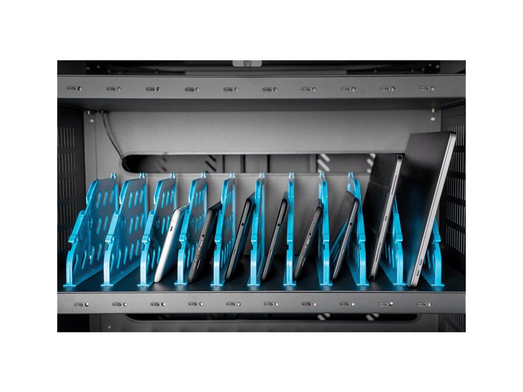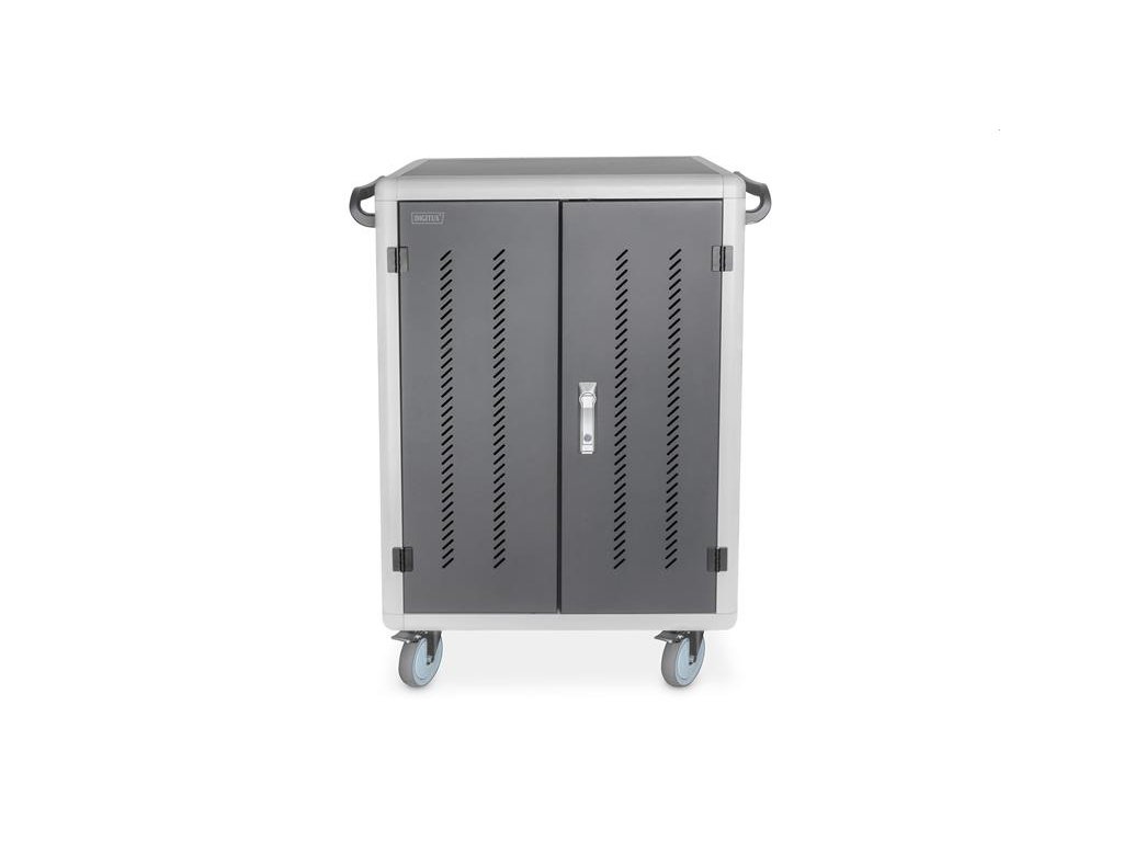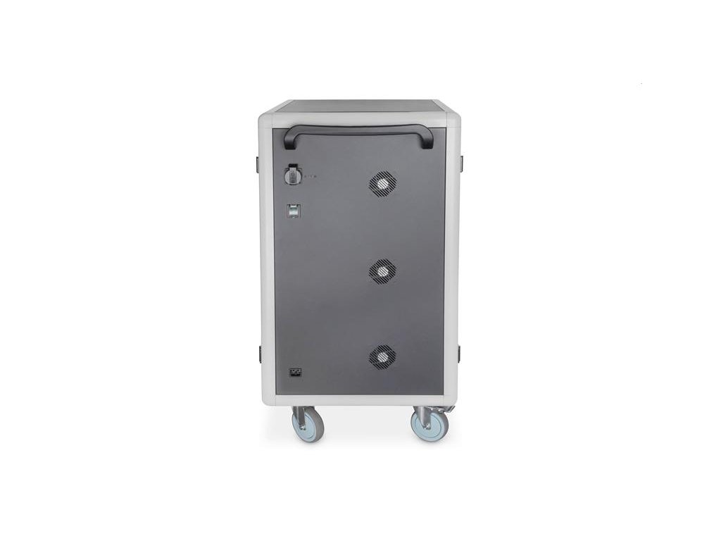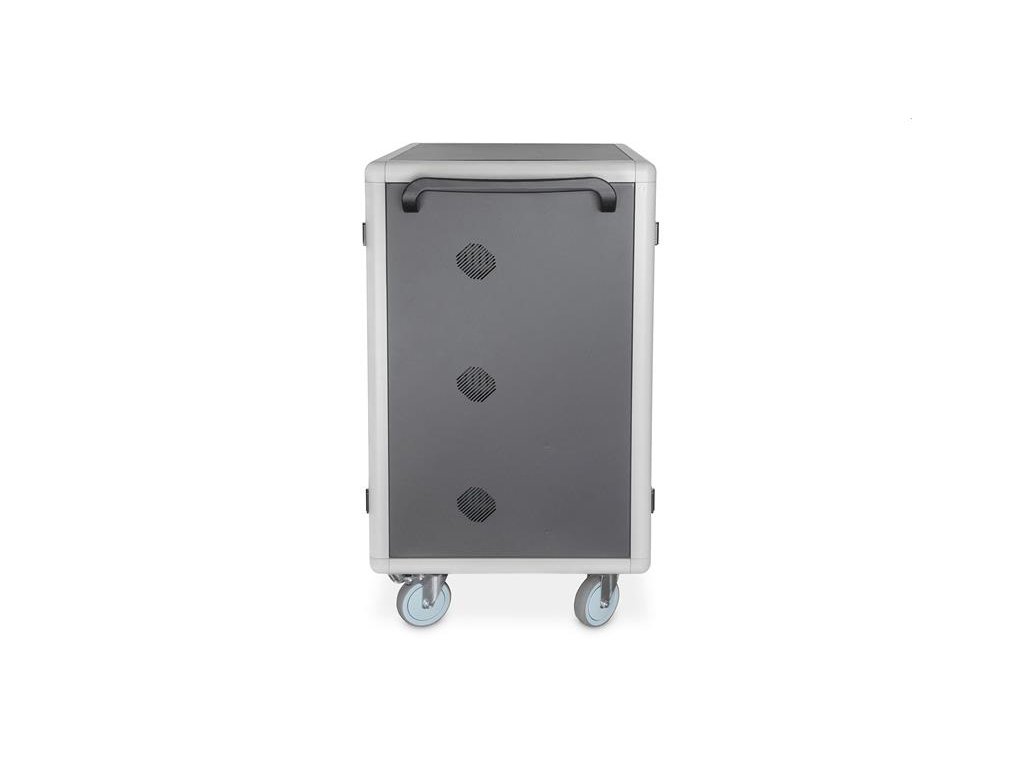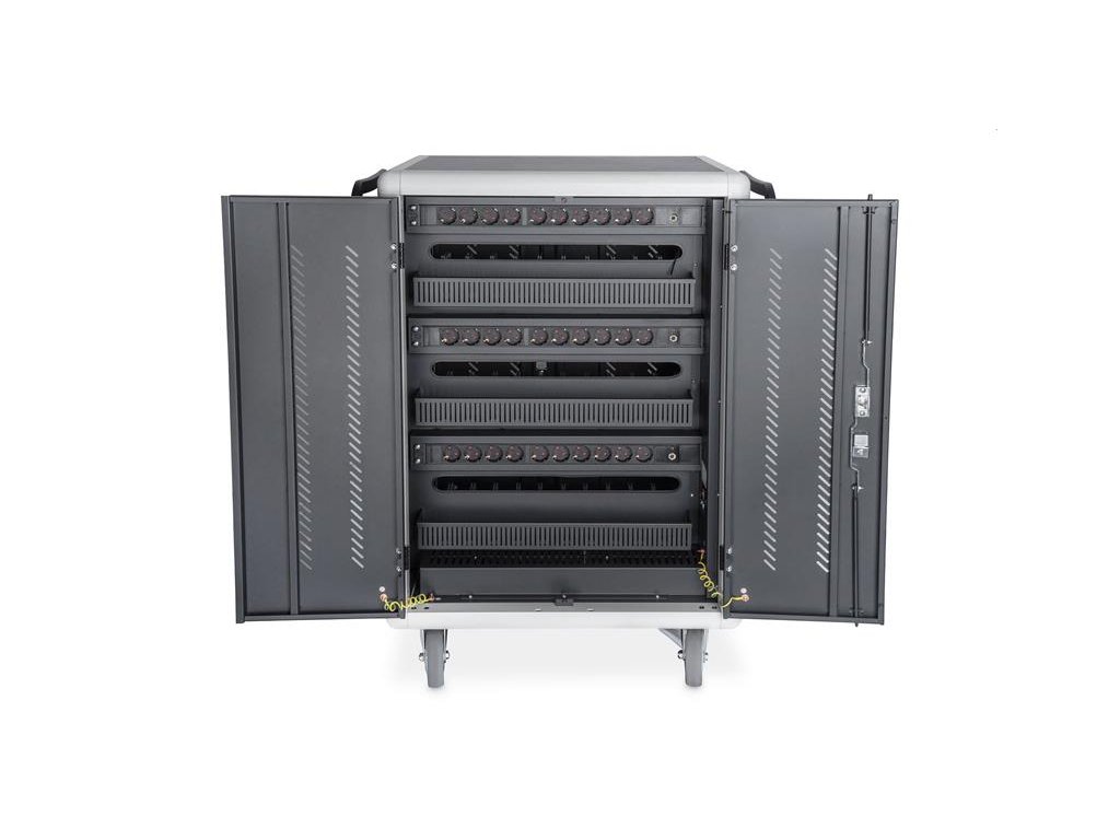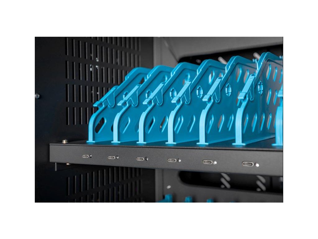 Charging trolley, 15.6", USB-C 30 charge bases, PDU, fan, 1260 x 824 x 650 mm The ideal solution for storing and charging your portable devices. 30 stations (3x10) for devices 30 x USB-C connection 18W (5V/3A, 9V/2A, 12V/1.5A), total power max. 540W 3 x socket strip installed on the back (10 x safety sockets) Cable feedthrough and excessive cable storage on each level Compact housing, mobile thanks to installed rollers 3 x ventilator (24 V) for active cooling of the cabinet Incl. RCD 30 mA (residual current operated device) TECHNICAL DETAILS Double Folding Front and Back Door Pressure lock system with swiveling lever handle on the front and back door, lockable 180° door opening angle 2-point locking (rod lock) Incl. 4 rollers (2 lockable) Casters can be dismantled if necessary Including handles for better mobility (enclosed) Product dimensions (H x W x D) in mm: 1260 x 824 x 650 mm Safety plug socket (AC) with switch on the side C20 connection on the side Incl. RCD 30 mA (residual current operated device) Delivery is completely assembled Depth of inner tray: 415 mm (suitable for up to 15,6" devices) USB-C Port Output: 18W (5 V 3A) per port; 540W max. Temperature control: Fans start automatically when the internal temperature exceeds 40 °C Blue plastic holders can be dismantled if necessary Color: black, RAL 9005 PACKAGE CONTENT Mobile charging cabinet 2 x handle (for installation on outside) including mounting material Power cable, 2 m User manual 4 x keysDodatočné parametre