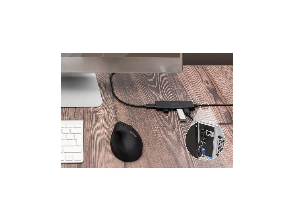 Rozbočovač USB 3.0, 4 porty, tenký s adaptérem USB-C, 5 Gb/s, 1,2 m kabel Rozšiřuje váš notebook s připojením USB-C nebo USB A o 4 další superrychlé porty USB. Navíc 4x USB A 3.0 s rychlostí až 5Gb/s k portu USB A nebo USB-C. HUB USB-C 3.0 a USB A 3.0, kombinace USB-A a USB-C je navržena tak, aby byl HUB kompatibilní s širokou škálou notebooků. Rozbočovač USB poskytuje až čtyři další možnosti připojení externích pevných disků, SSD nebo jiných zařízení USB v počítači, notebooku nebo tabletu. Díky standardu Super-Speed USB 3.0 je možný rychlý přenos dat rychlostí až 5 Gb/s - díky zpětné kompatibilitě jsou podporovány také rozhraní USB 2.0 a USB 1.1. Integrované připojení USB-C umožňuje poskytnout USB HUBu další napájení (nabíjecí kabel/adaptér není součástí dodávky). Pro optimální umístění rozbočovače USB na stole nebo ve skříňce s televizorem má zařízení pevný, 120 cm dlouhý připojovací kabel. Kompatibilní s mnoha operačními systémy, např. macOS, Windows a Google Chrome OS. Rozbočovač DIGITUS USB 3.0 Hub Slim Line je ideálním rozšířením pro každé pracoviště. Až čtyři zařízení USB lze připojit a používat současně, což usnadňuje použití více vstupních zařízení nebo přenosných úložných zařízení. Díky technologii USB 3.0 dosahují datové přenosy rychlosti až 5 Gbps a zajišťují nejrychlejší výměnu dat. Díky tenkému designu je 4portový hub ideálním společníkem na cestách, ale je také nepostradatelný v domácnosti a kanceláři. Pomocí 1,2m kabelu můžete upravit délku tak, aby dokonale odpovídala vašemu notebooku nebo pracovní stanici. TECHNICKÉ ÚDAJE Čtyři porty USB 3.0 s rychlostí až 5 Gb/s Podporuje superrychlostní (5 Gbps), vysokorychlostní (480 Mbps) a plnou rychlost (12 Mbps) datové přenosy Dolů kompatibilní s USB 2.0 a 1.1 Délka kabelu: 1,2m Hmotnost: 42,3 g Barva: černá Rozměry: d 10,5 x š 3,0 x v 1,0 cm Provozní teplota: 0°C - 40°C (35°F až 100°F) Konektory USB-A (3.0): 4 USB-C konektory: 1 OBSAH BALENÍ 1x USB HUB 1x adaptér USB A na USB-C 1x Návod k použitíDodatočné parametre
