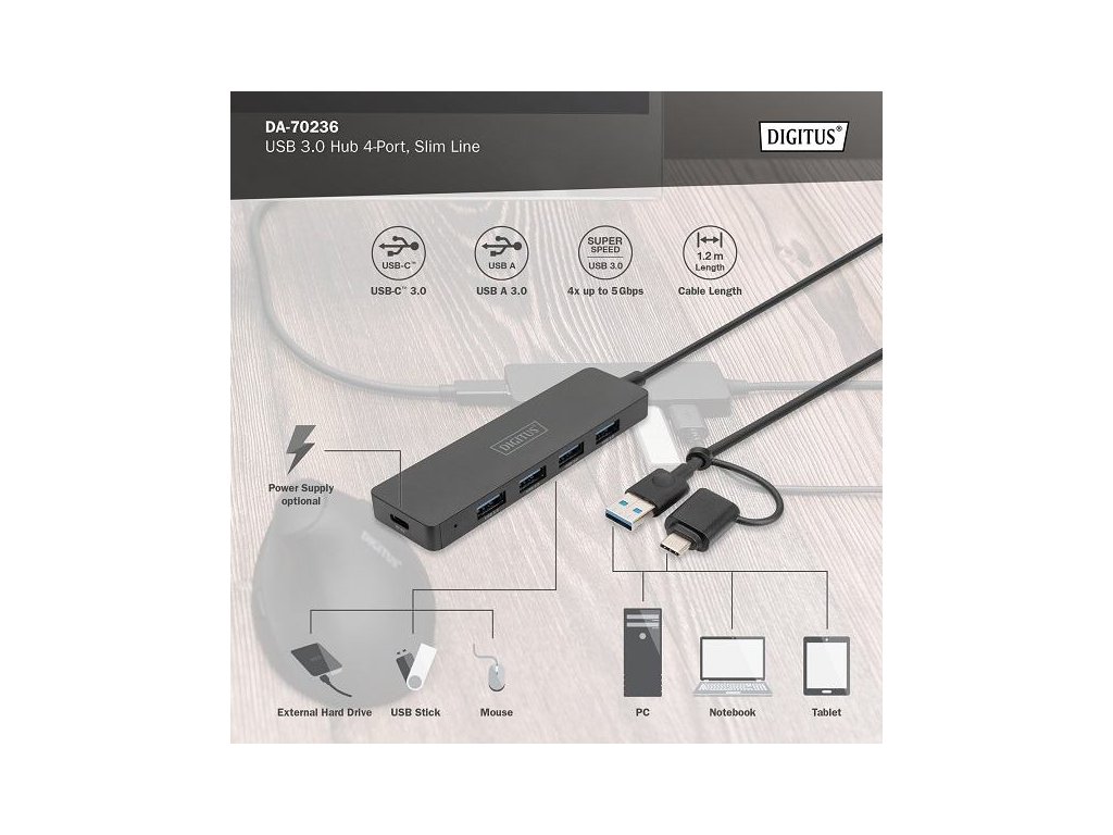 Digitus USB 3.0 Hub 4-Port, Slim Line, 1,2m kabel