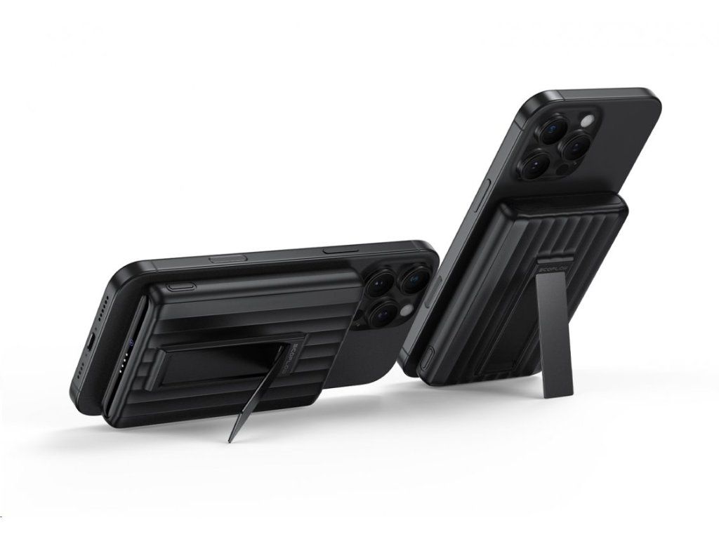 Pevné magnetické uchytenie mobilu pomocou magnetov N52 a skladací vstavaný stojan umožňujú využitie EcoFlow RAPID Mag Power Bank 10K aj ako podpory, ktorá zaistí pohodlné sledovanie videí alebo čítanie správ na displeji telefónu.