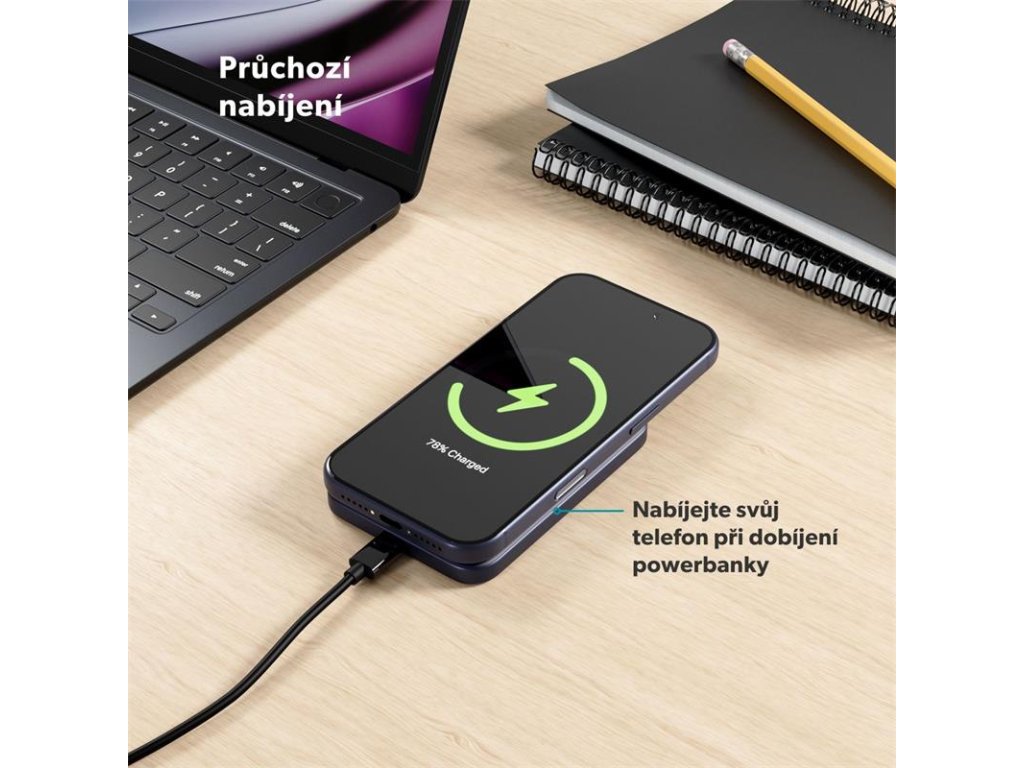 Okrem bezdrôtového nabíjania ponúka powerbanka aj USB-C Power Delivery (PD) port s výkonom až 20 W. To vám umožní nabiť telefón až o 50% rýchlejšie počas iba 30 minút. Ideálne pre situácie, keď potrebujete doplniť energiu čo najrýchlejšie.