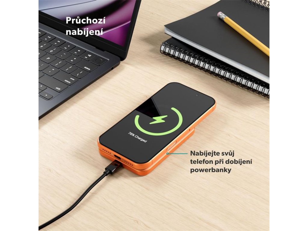Okrem bezdrôtového nabíjania ponúka powerbanka aj USB-C Power Delivery (PD) port s výkonom až 20 W. To vám umožní nabiť telefón až o 50% rýchlejšie počas iba 30 minút. Ideálne pre situácie, keď potrebujete doplniť energiu čo najrýchlejšie.