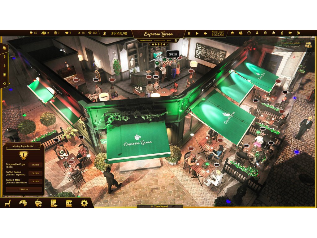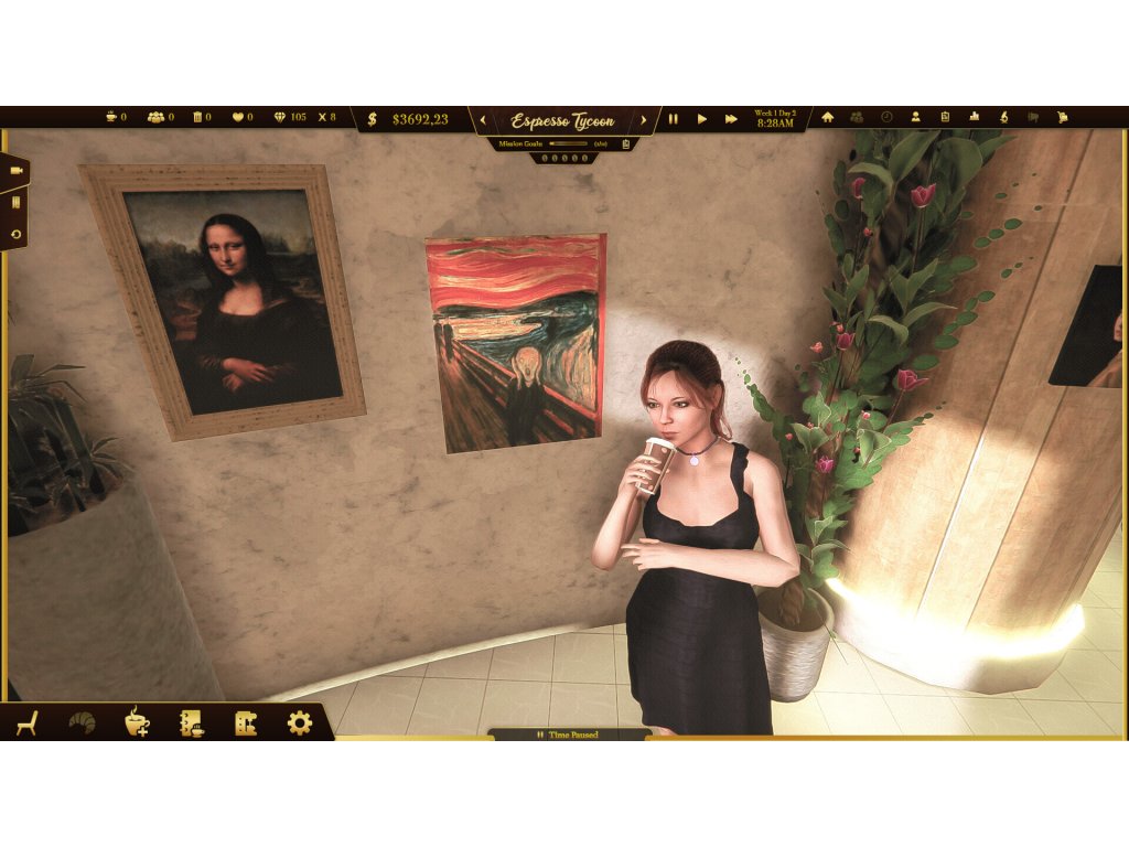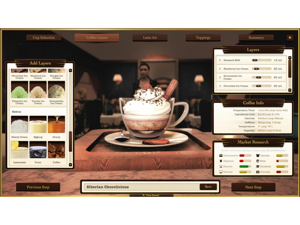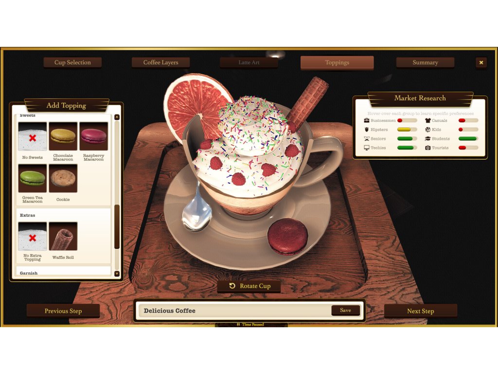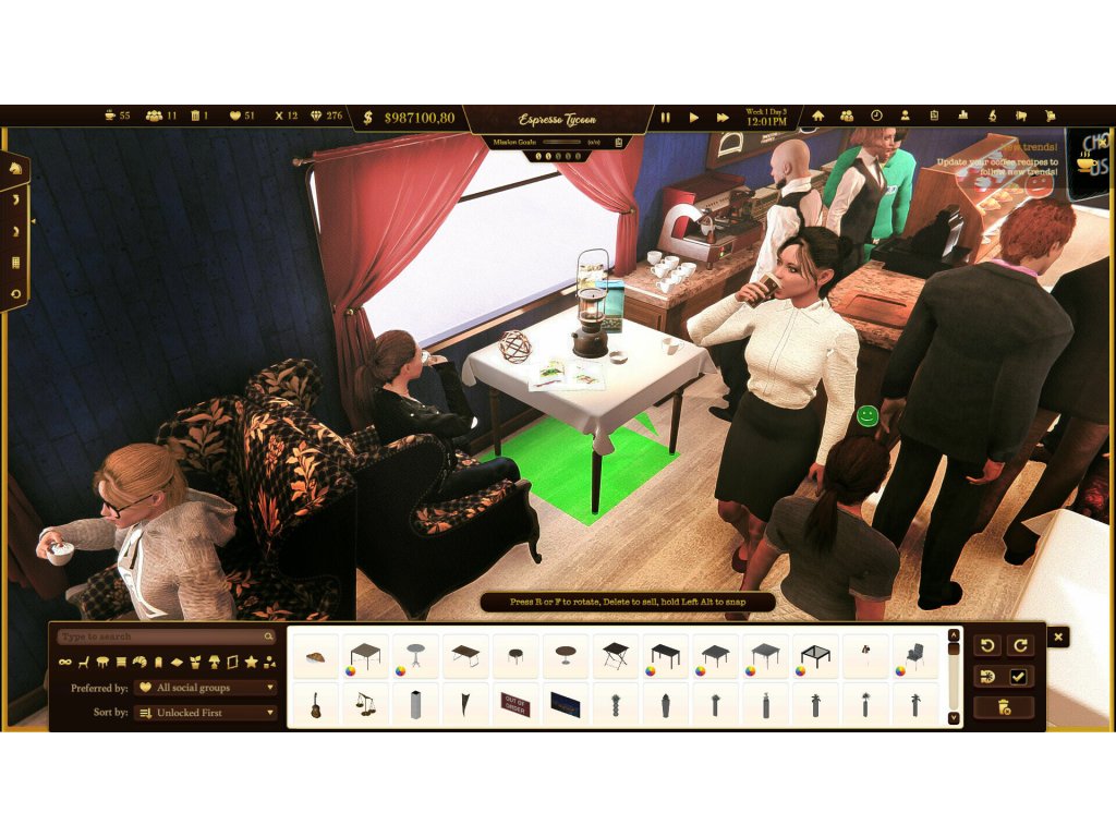 Espresso Tycoon - a coffee shop simulator. Create your brand, decorate the coffee shop, manage your employees, and take care of your customers. Use the 3D coffee editor to create coffee recipes, order supplies, and collect rating points. Build the whole coffee business and complete all the missions!