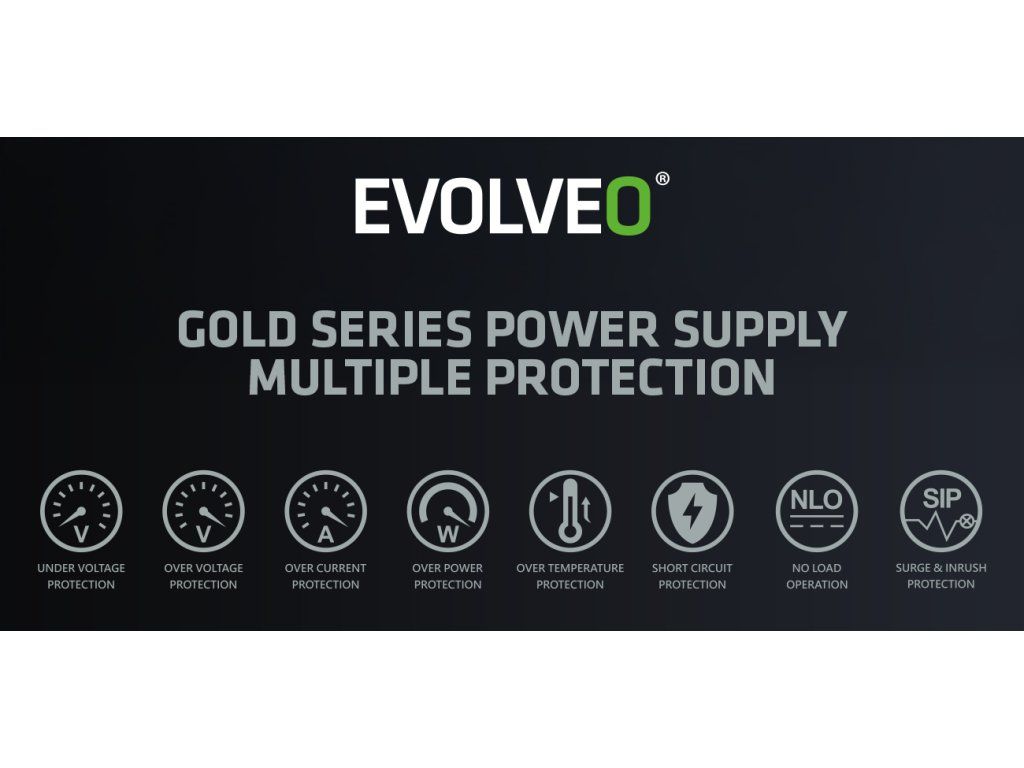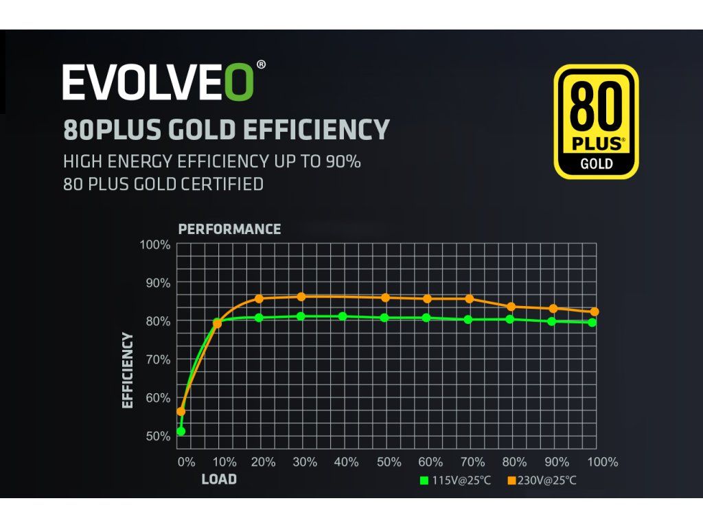 PC zdroj EVOLVEO G1000-BK je hrdým držitelem certifikace80 PLUS Gold, která slibuje až 92% účinnost (při běžném 50% zatížení). Minimální ztráty energie a nízké zahřívání jdou přitom ruku v ruce s tichým chodem