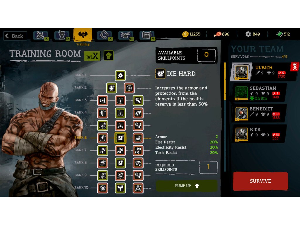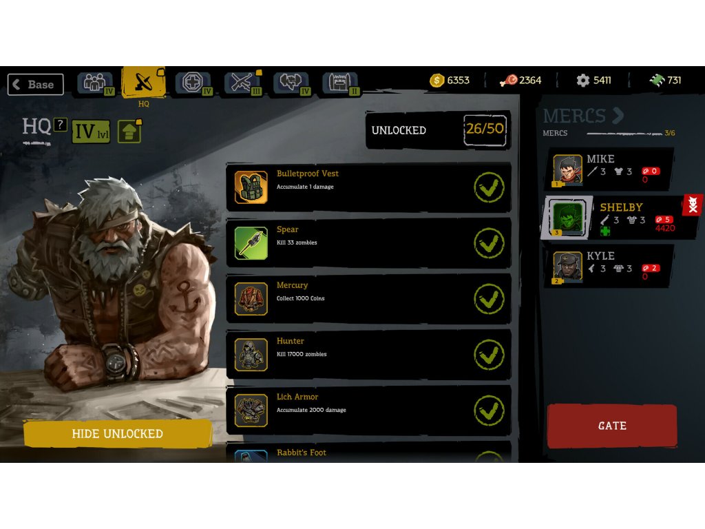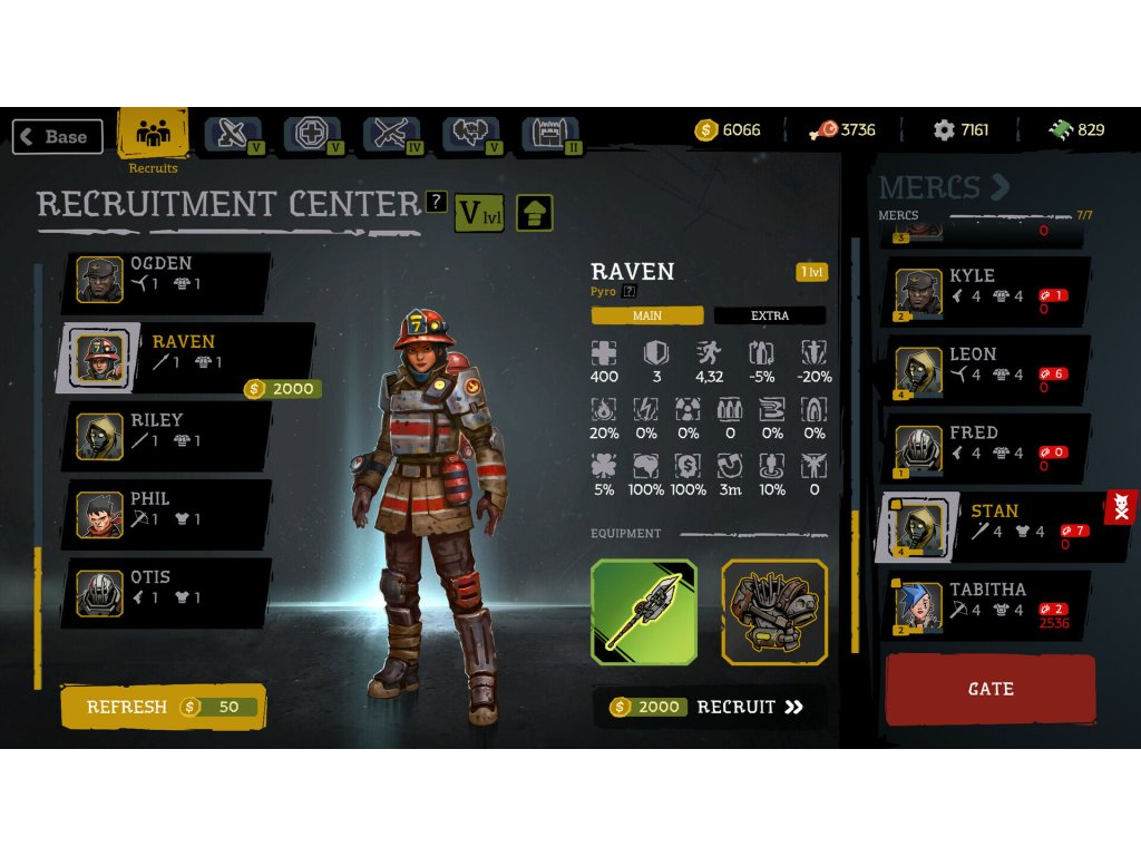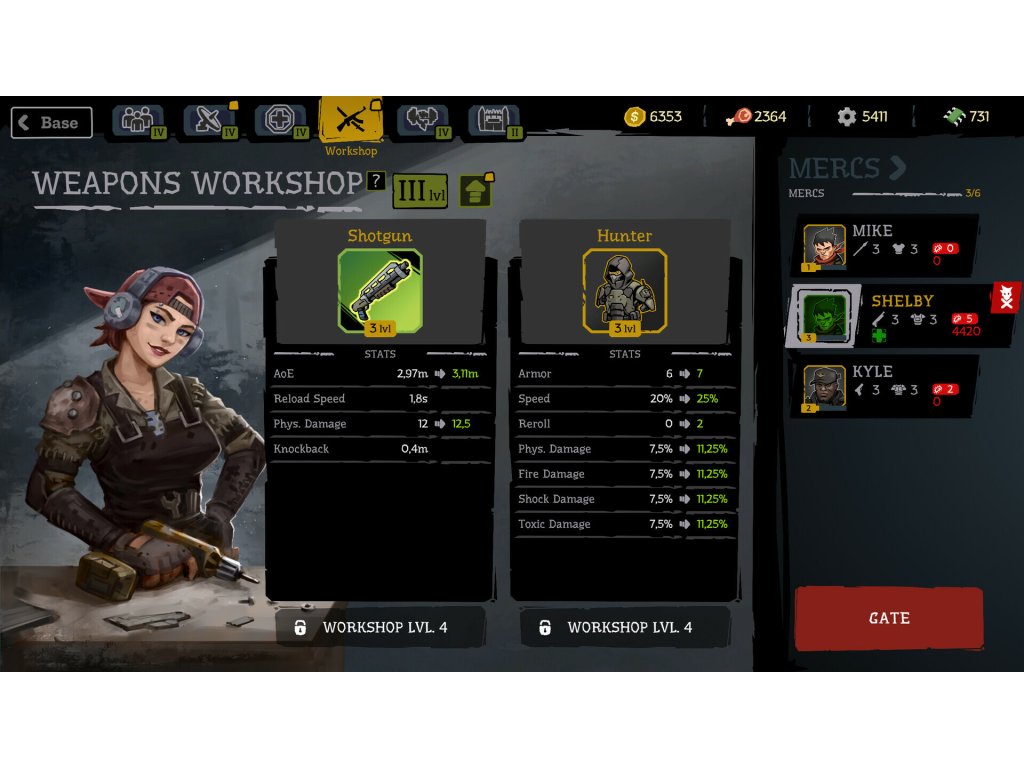 Develop your survivor camp to unlock buffs. Upgrade merc skills in the Training Hall, recruit new mercs at the Mercenary Base, and upgrade your weapons and armor in the workshop. Upgraded buildings increase your chances of survival.