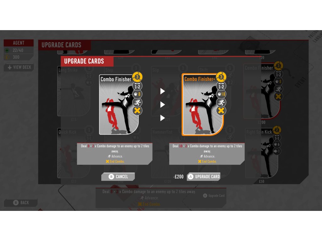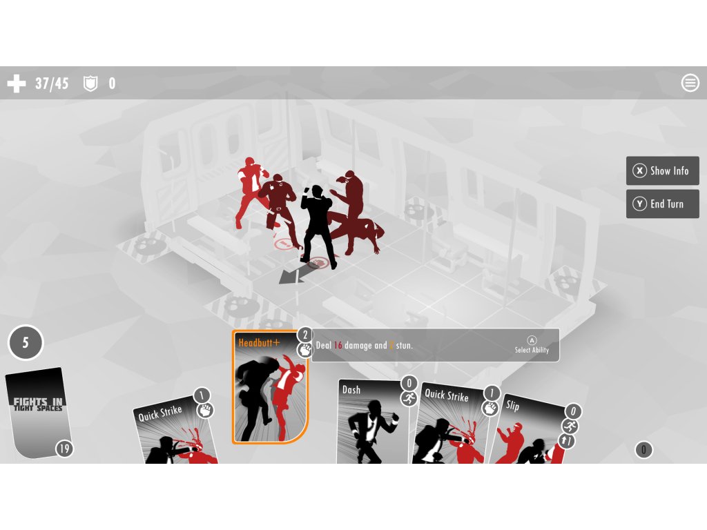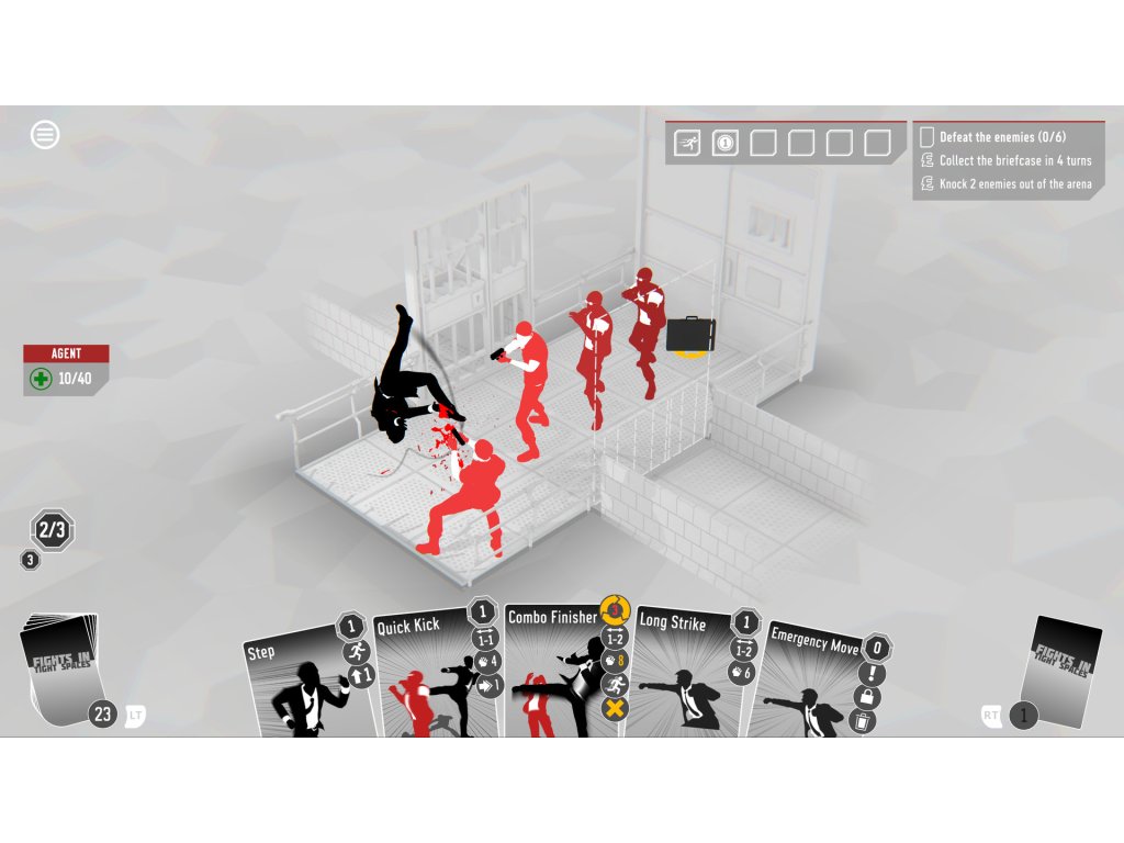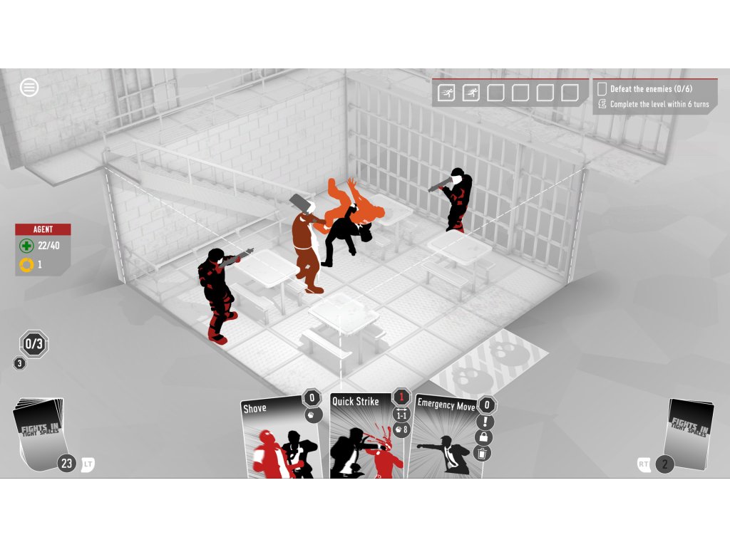 Fights in Tight Spaces blends deck-building, turn-based tactics, and thrilling animated fight sequences in classic action-movie settings. Learn to balance your hand, momentum, and positioning to overcome the odds to defeat your adversaries.Pick from over 150 cards as you build a deck to suit your play style and your opponents’. Encounter random events, acquire enhancements (or injuries), and make critical choices about how best to upgrade your agent for the fights ahead.
